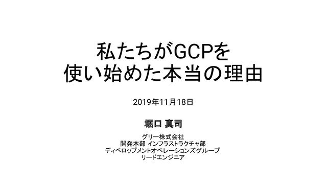 私たちがGCPを 使い始めた本当 理由 2019年11月18日 堀口 真司 グリー株式会社 開発本部 インフラストラクチャ部 ディベロップメントオペレーションズグループ