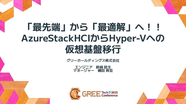 「最先端」から「最適解」へ!! AzureStackHCIからHyper-Vへの 仮想基盤移行 グリーホールディングス株式会社 エンジニア 耕崎 稔生 マネージャー 磯田 典宏