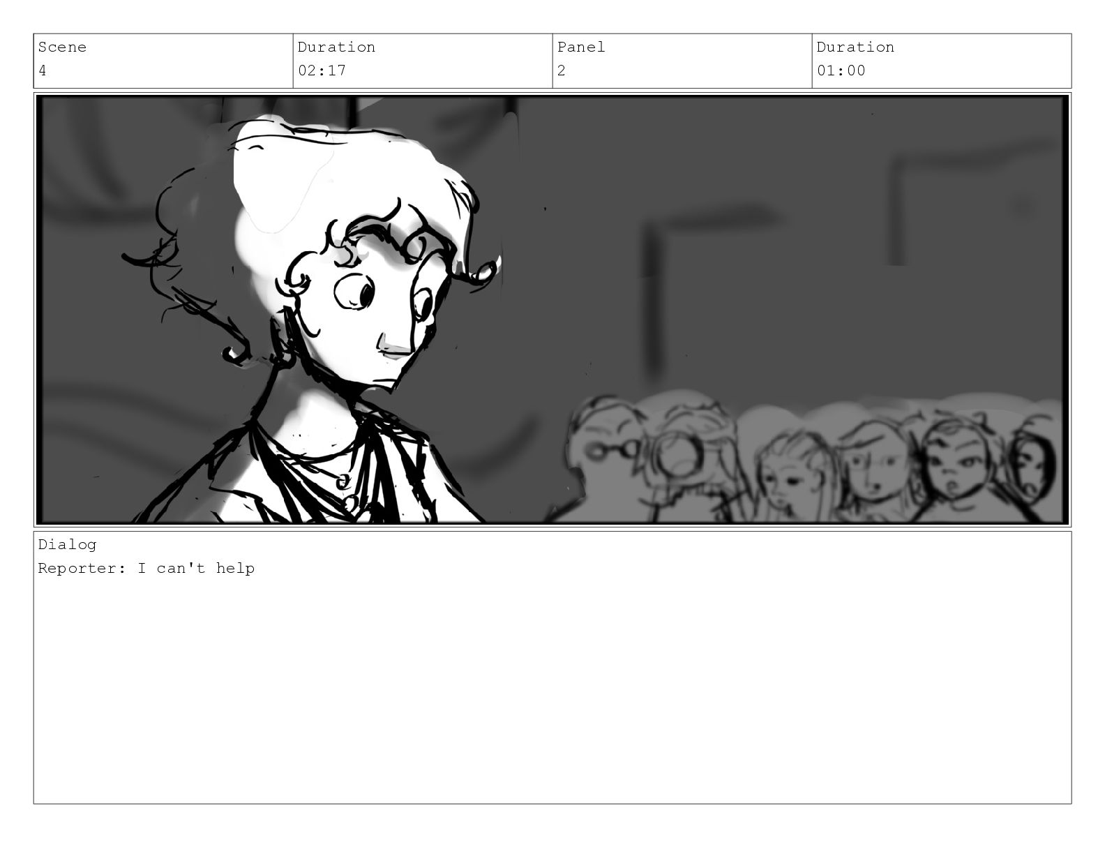 Scene 4 Duration 02:17 Panel 2 Duration 01:00 Dialog Reporter: