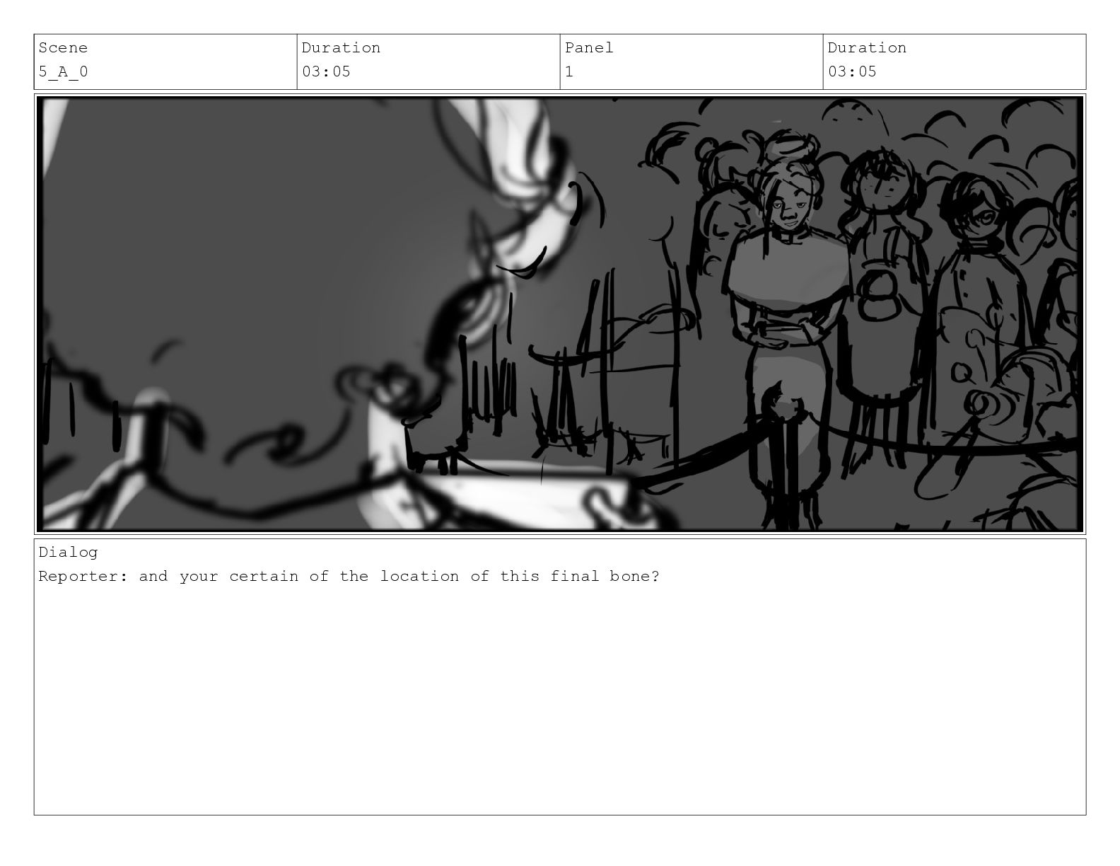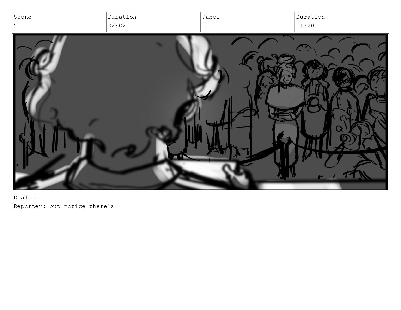 Scene 5 Duration 02:02 Panel 1 Duration 01:20 Dialog Reporter: