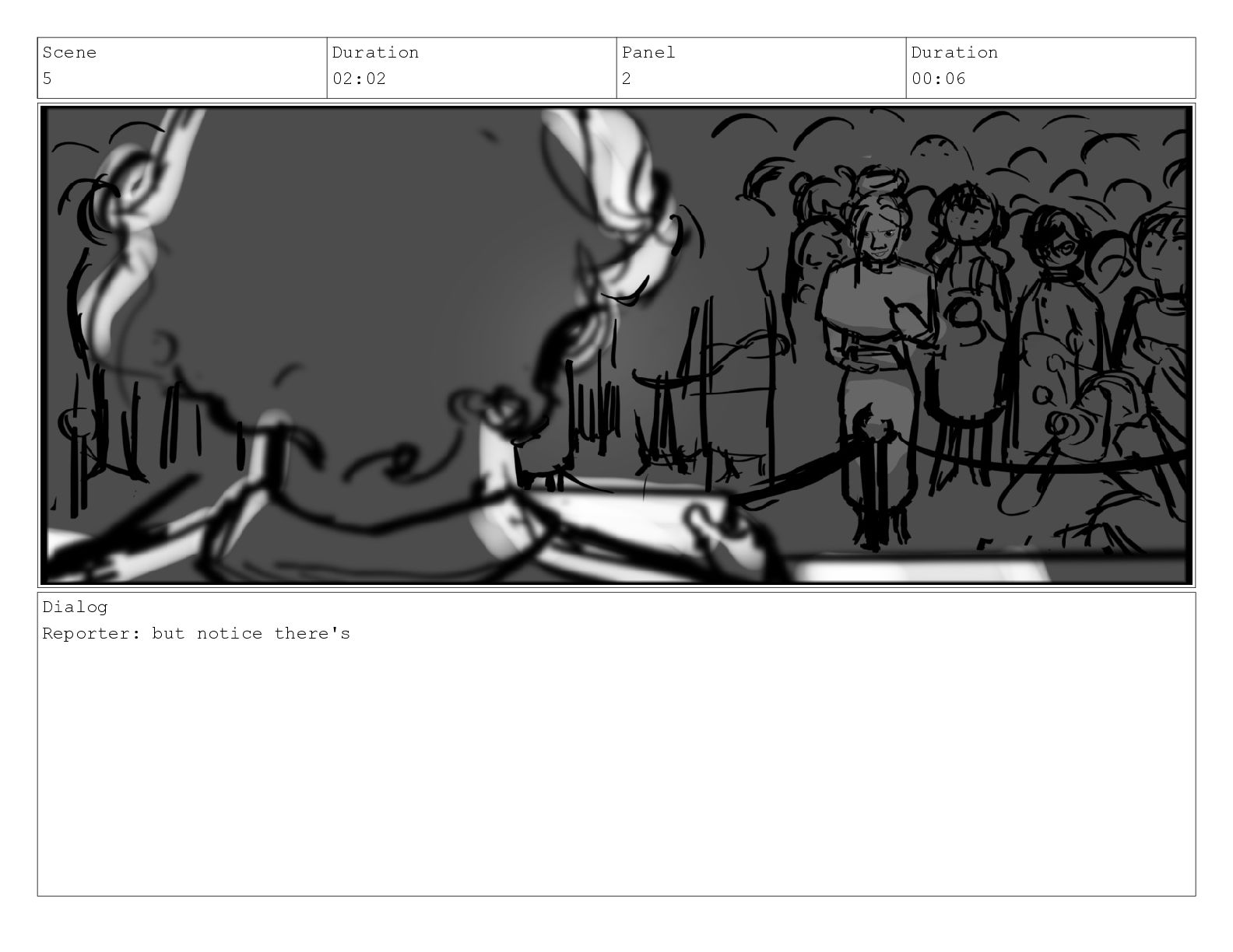 Scene 5 Duration 02:02 Panel 2 Duration 00:06 Dialog Reporter: