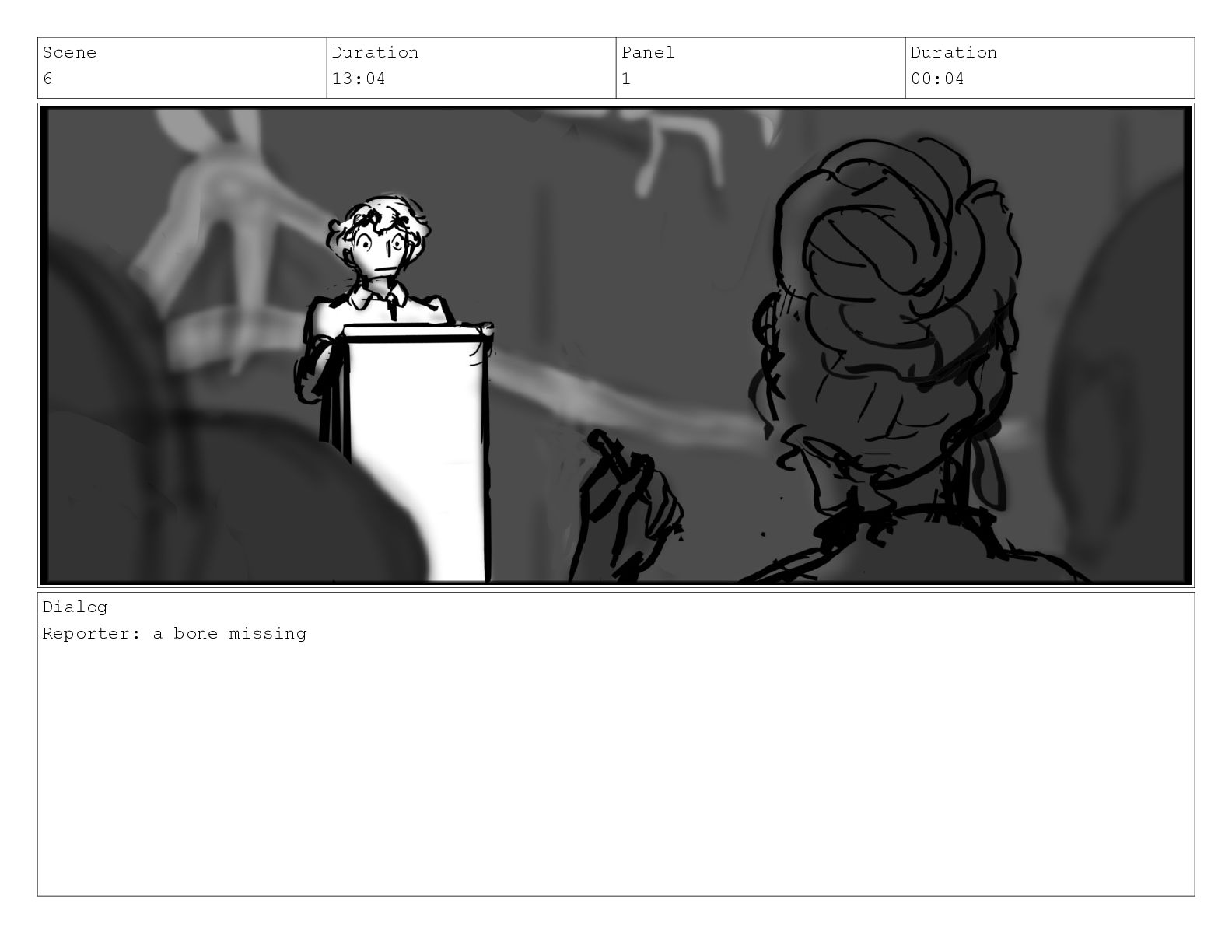 Scene 6 Duration 13:04 Panel 1 Duration 00:04 Dialog Reporter: