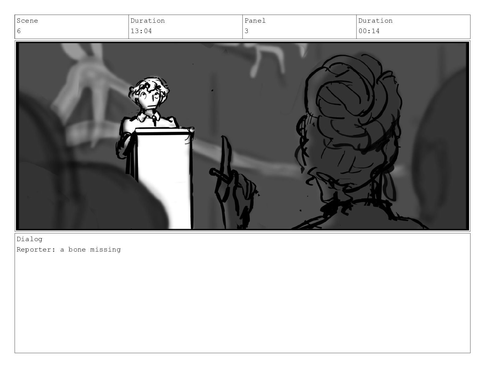Scene 6 Duration 13:04 Panel 3 Duration 00:14 Dialog Reporter: