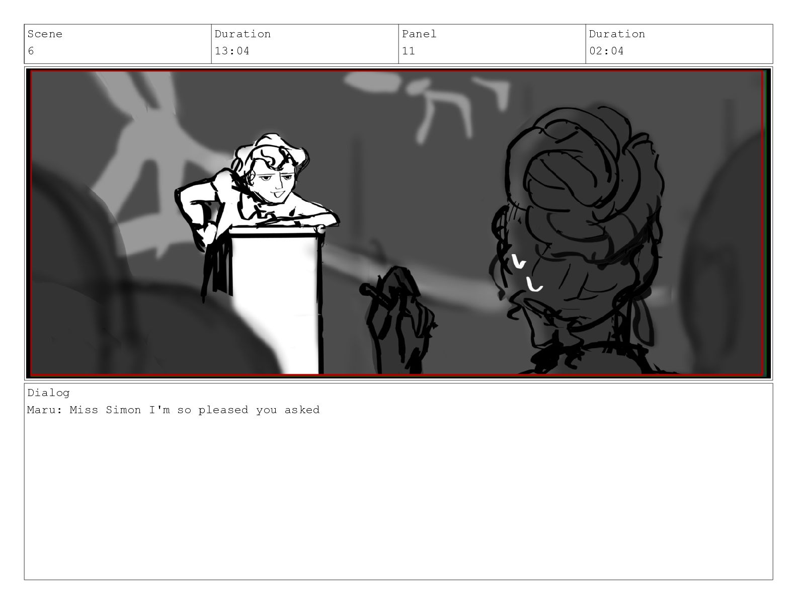 Scene 6 Duration 13:04 Panel 11 Duration 02:04 Dialog Maru: