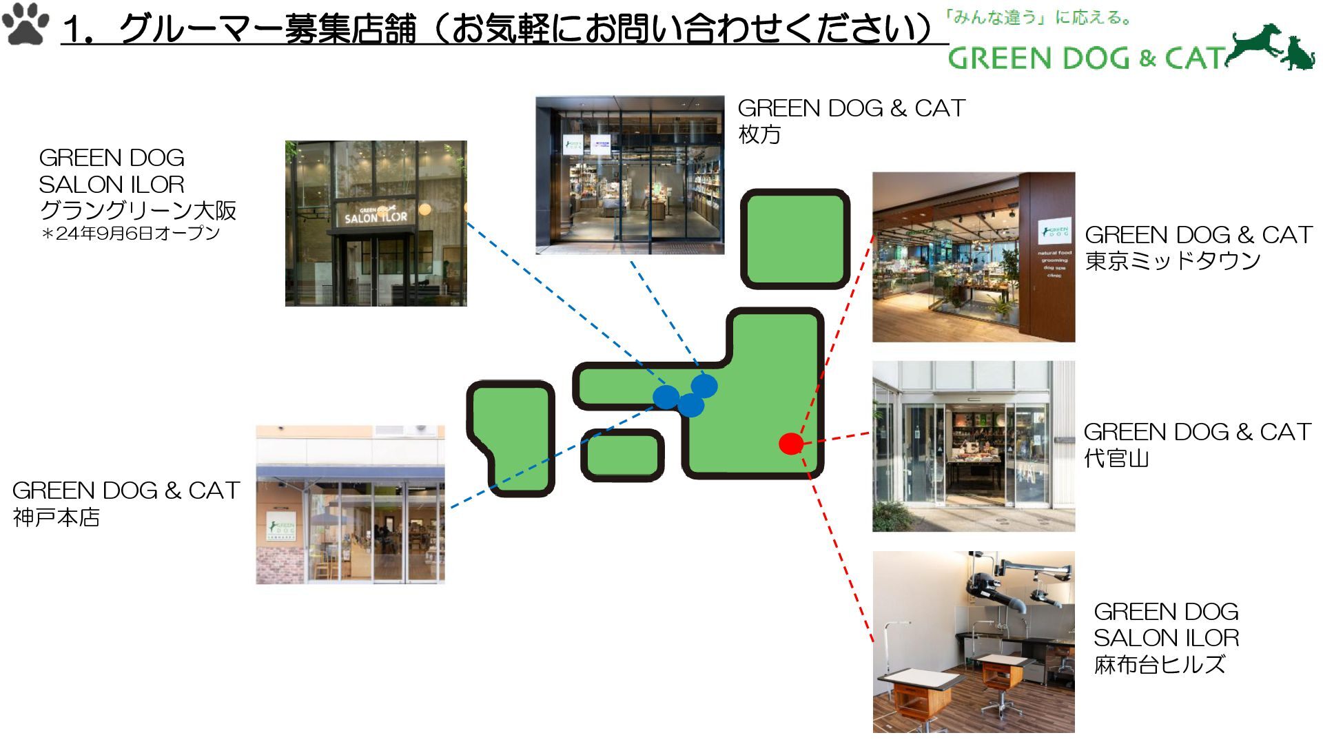 代官山 GREEN DOG SALON ILOR 麻布台ヒルズ GREEN DOG & CAT 神戸本店 GREEN DOG & CAT 枚方 GREEN DOG SALON ILOR グラングリーン大阪 *24年9月6日オープン
