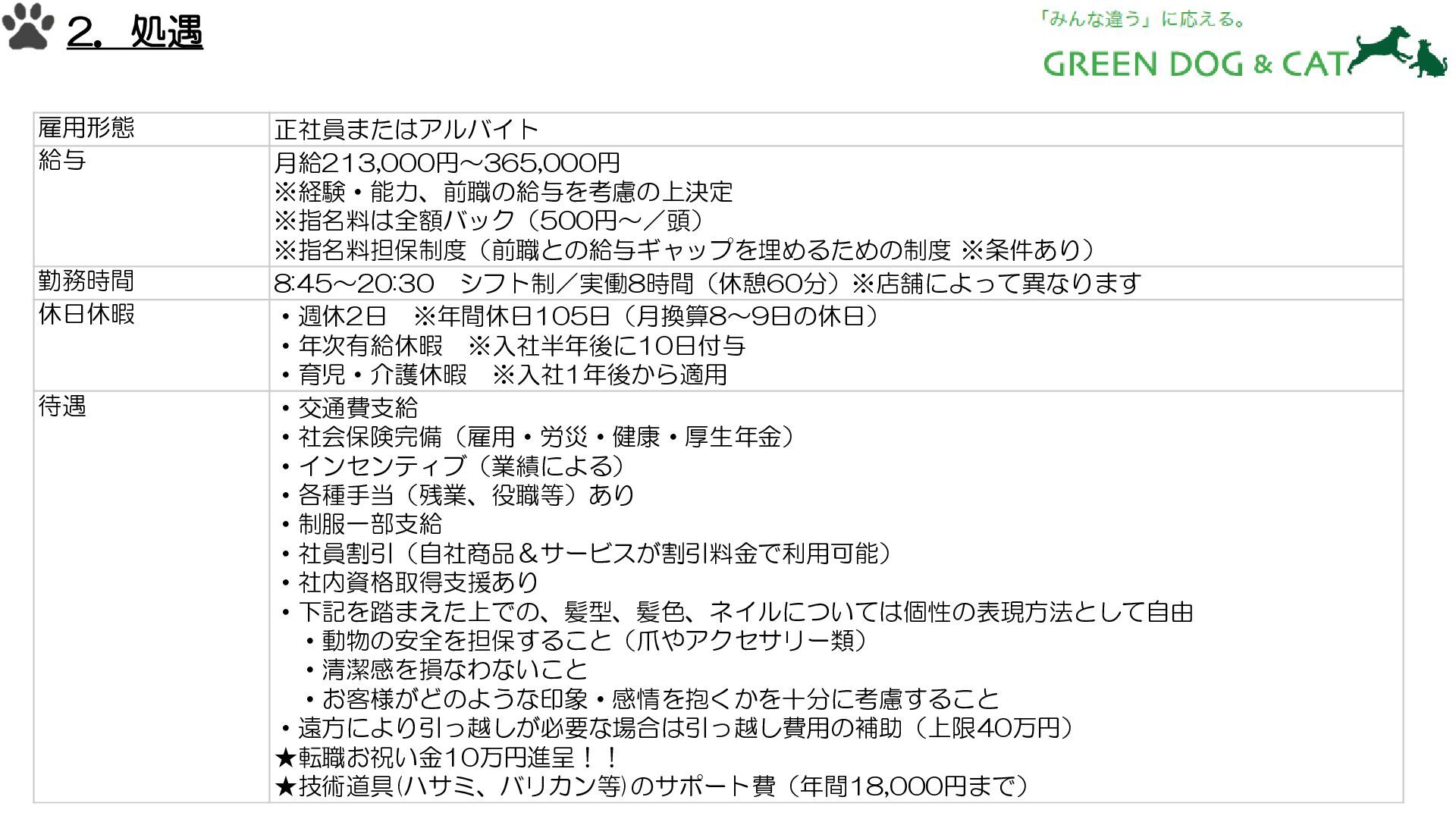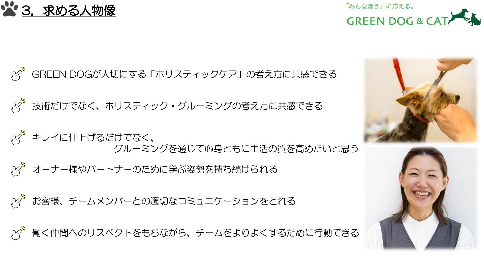 3.求める人物像 GREEN DOGが大切にする「ホリスティックケア」の考え方に共感できる 技術だけでなく、ホリスティック・グルーミングの考え方に共感できる キレイに仕上げるだけでなく、 グルーミングを通じて心身ともに生活の質を高めたいと思う オーナー様やパートナーのために学ぶ姿勢を持ち続けられる お客様、チームメンバーとの適切なコミュニケーションをとれる 働く仲間へのリスペクトをもちながら、チームをよりよくするために行動できる