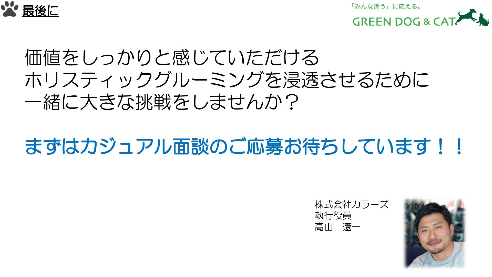 最後に 価値をしっかりと感じていただける ホリスティックグルーミングを浸透させるために 一緒に大きな挑戦をしませんか? まずはカジュアル面談のご応募お待ちしています!! 株式会社カラーズ 執行役員 高山 遼一