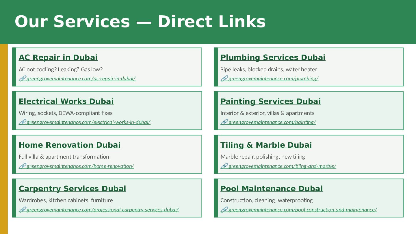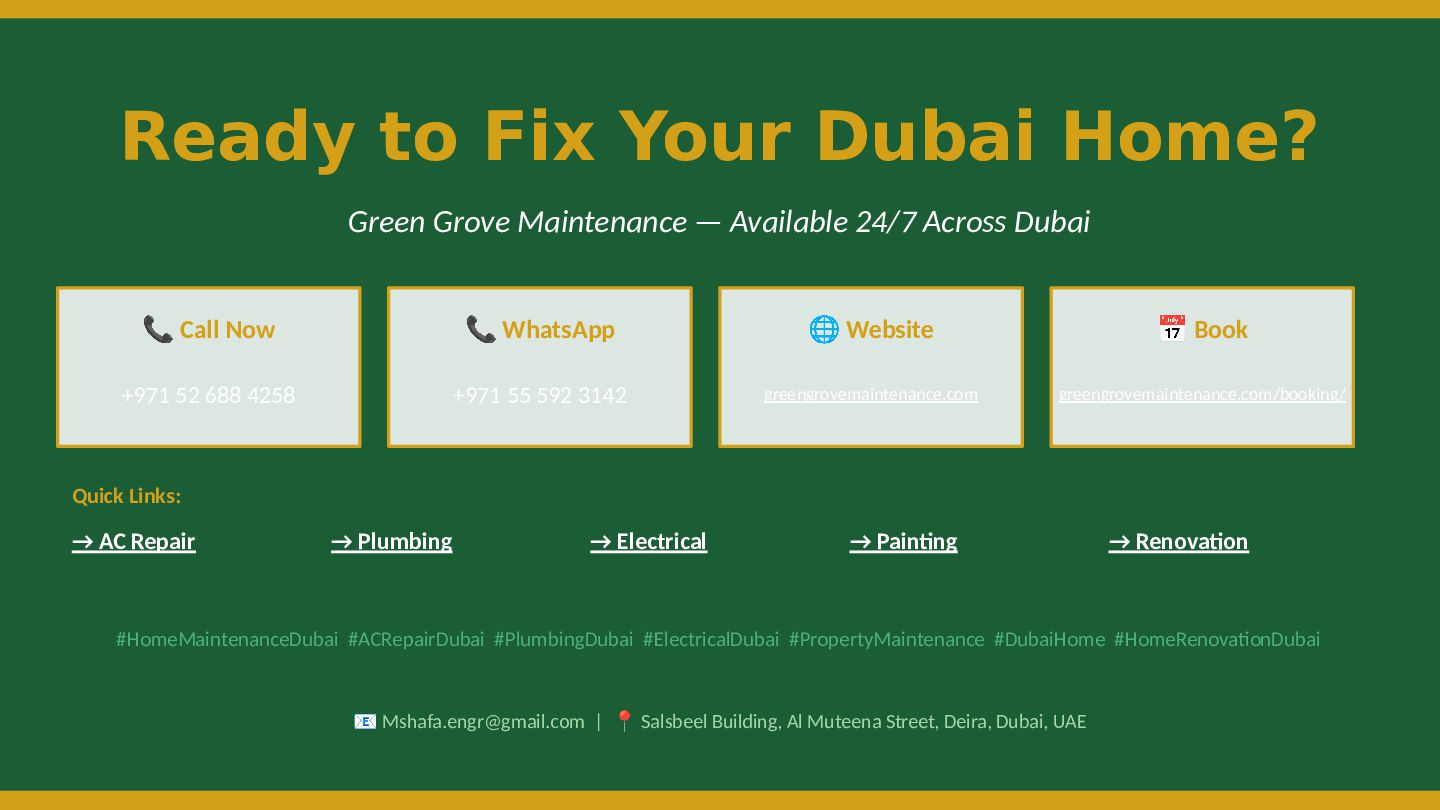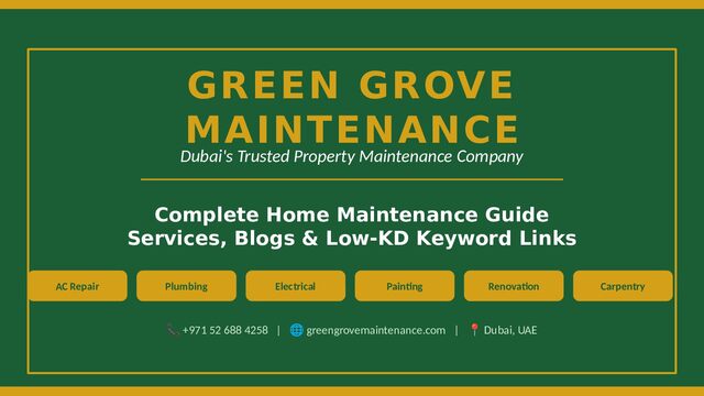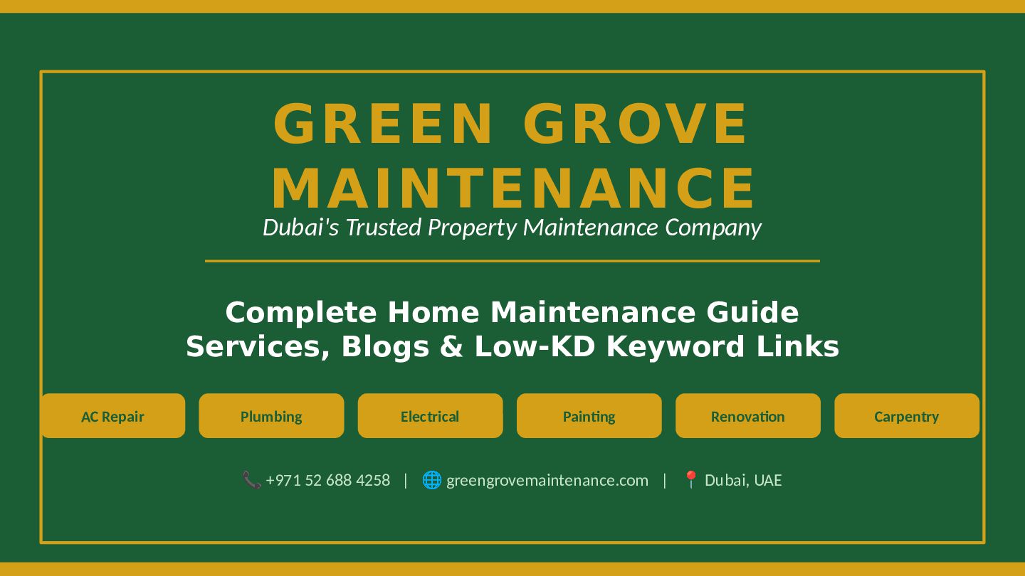 Maintenance Guide β AC, Plumbing, Electrical, Painting & Renovation (2026) π DESCRIPTION: Green Grove Maintenance is Dubai's most trusted home maintenance company β providing expert AC repair, plumbing, electrical work, painting, tiling, carpentry, and full home renovation across Dubai and UAE. This guide covers the most important home maintenance topics for Dubai villa and apartment owners in 2026, including low- KD keywords, service links, and professional tips. Whether you need emergency AC repair in Dubai, professional plumbing services, or complete home renovation β we cover it all. π +971 52 688 4258 | greengrovemaintenance.com #HomeMaintenanceDubai #ACRepairDubai #PlumbingDubai #PropertyMaintenanceDubai #DubaiHome