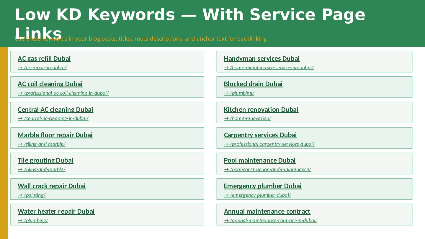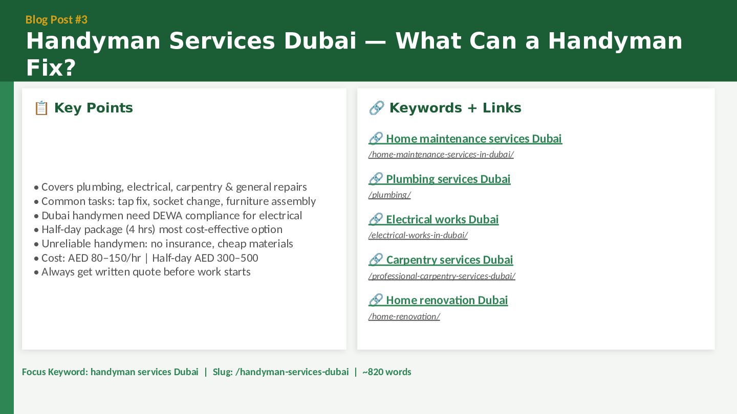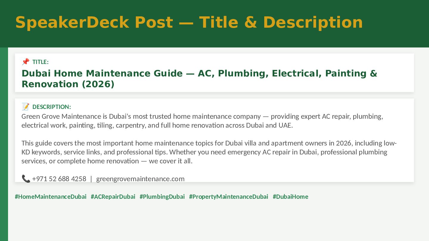 Maintenance Guide β AC, Plumbing, Electrical, Painting & Renovation (2026) π DESCRIPTION: Green Grove Maintenance is Dubai's most trusted home maintenance company β providing expert AC repair, plumbing, electrical work, painting, tiling, carpentry, and full home renovation across Dubai and UAE. This guide covers the most important home maintenance topics for Dubai villa and apartment owners in 2026, including low- KD keywords, service links, and professional tips. Whether you need emergency AC repair in Dubai, professional plumbing services, or complete home renovation β we cover it all. π +971 52 688 4258 | greengrovemaintenance.com #HomeMaintenanceDubai #ACRepairDubai #PlumbingDubai #PropertyMaintenanceDubai #DubaiHome