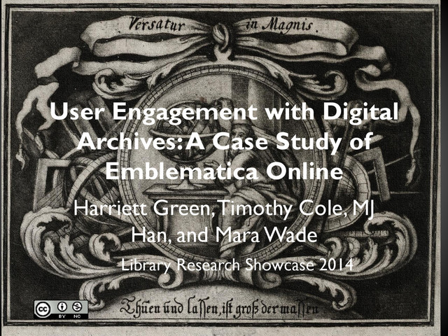 Reference Resources • Provides single point of access to digitized emblem books from libraries in U.S., Germany, Netherlands, UK • Conducting a user study of the Open Emblem Portal http://emblematica.library.illinois.edu @greenharr [email protected]