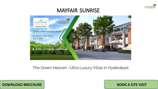 Experience the epitome of elegance with our ultra luxury villas in Hyderabad, designed to cater to your every need. Whether you're seeking a 4 BHK luxury villa for sale in Hyderabad or simply looking for a peaceful retreat, Mayfair Sunrise has something for everyone.