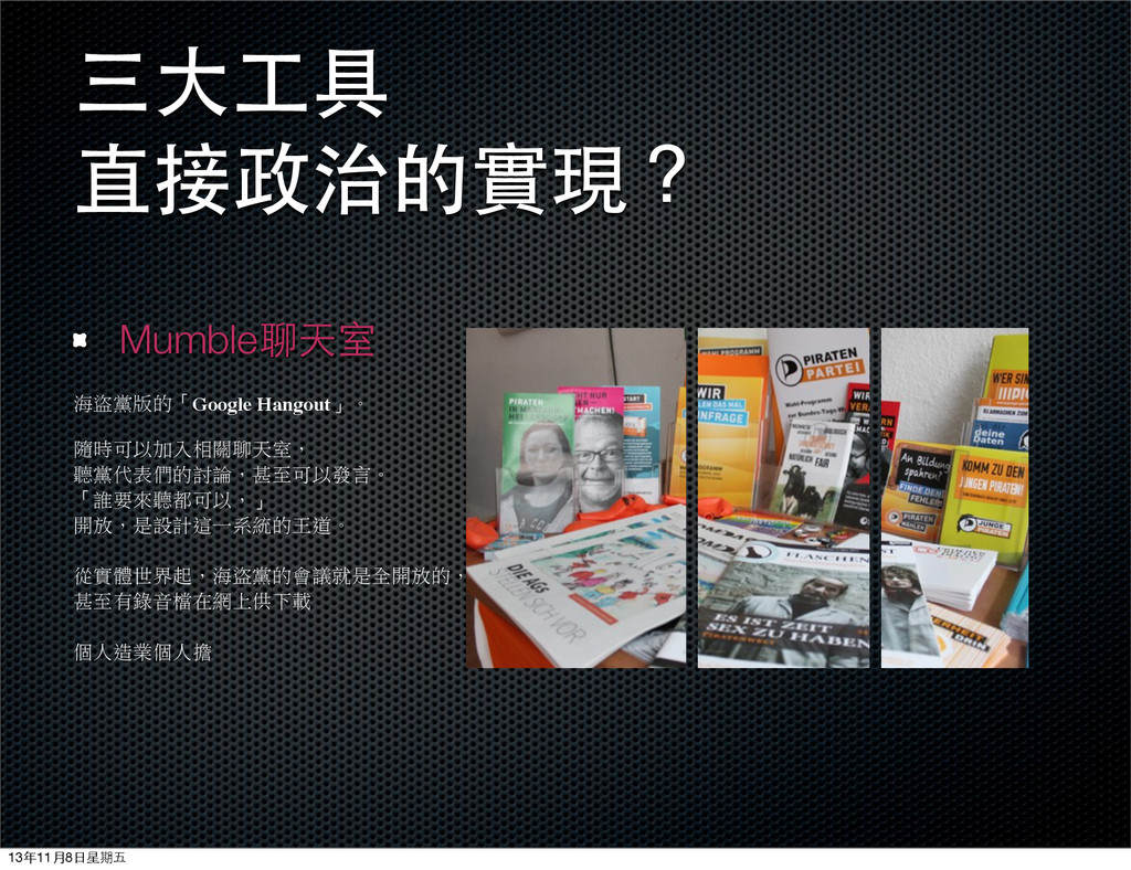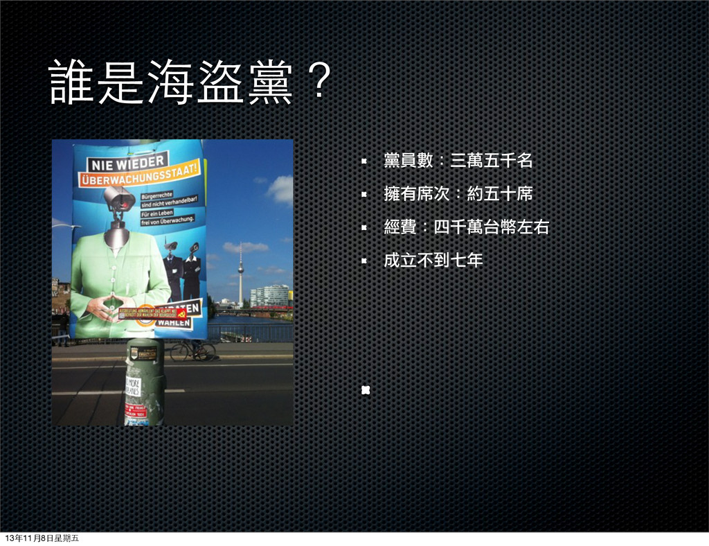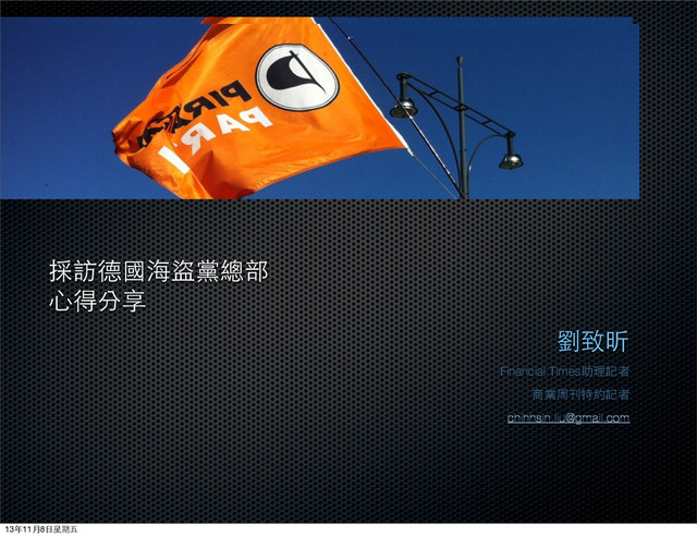 綠黨網路支黨部在11月8日正式成立,特別邀請了英國金融時報記者、商周特約記者劉致昕分享歐洲小黨「海盜黨」的觀察。