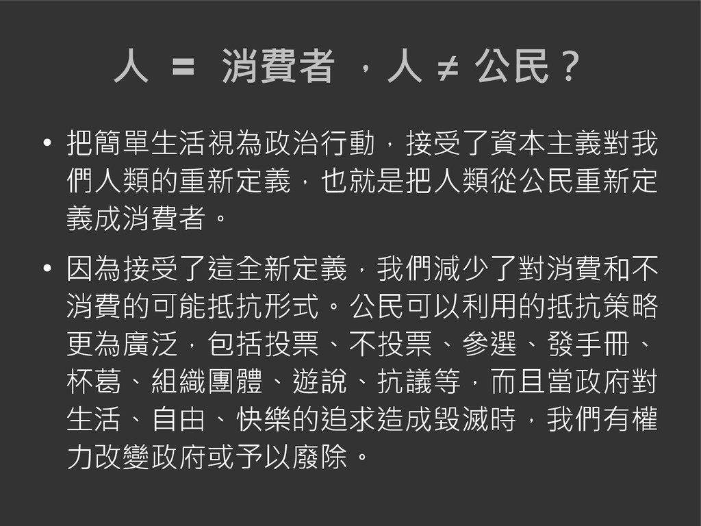 人 = 消費者 ,人 ≠ 公民? • 把簡單生活視為政治行動,接受了資本主義對我 們人類的重新定義,也就是把人類從公民重新定 義成消費者。