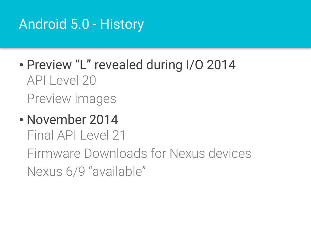 more powerful Notifications Privacy setting for lockscreen Heads up notifications (floating) • Camera2 API, deprecates Camera More control, burst mode, etc. • Job scheduling to save battery Enqueue jobs and let the system decide when