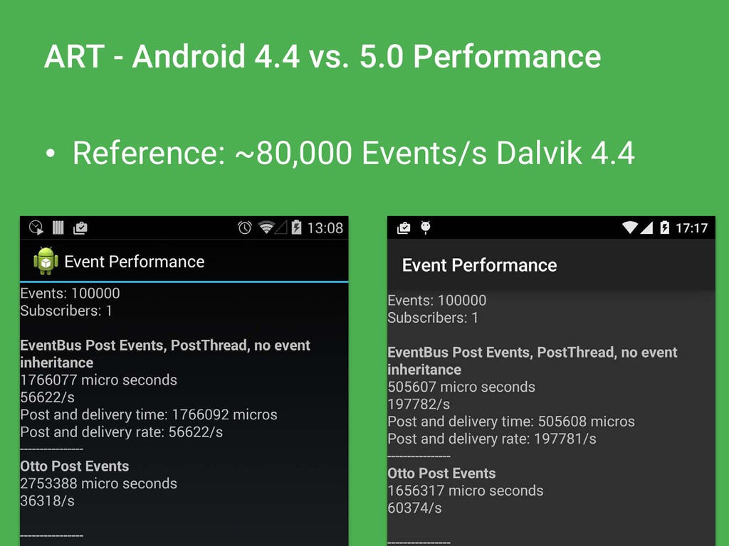out System.gc(); // in certain situtations only! • ART handles those situations better • Detect ART to optimize System.getProperty("java.vm.version") // "2.0.0" or above == ART