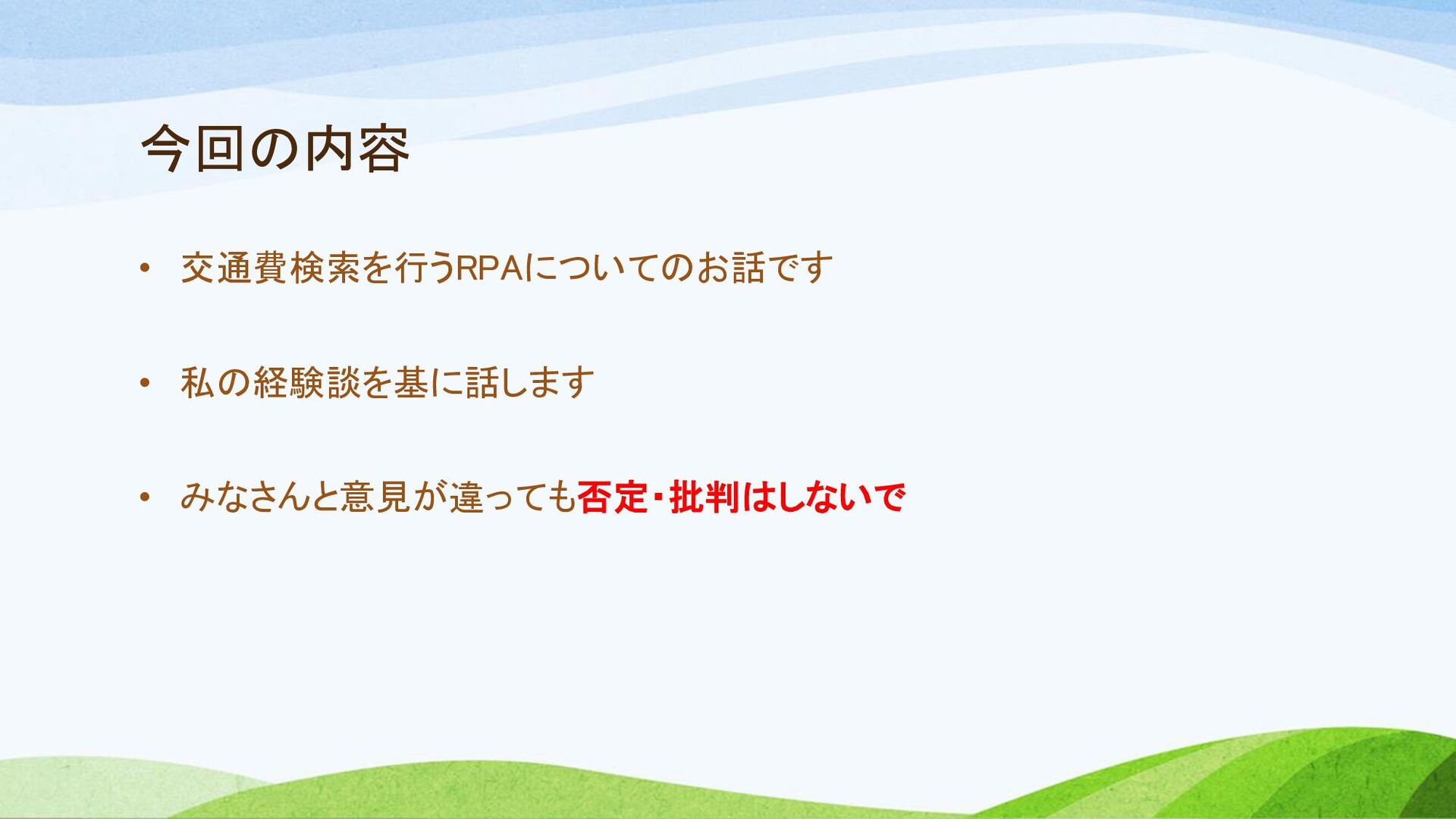 今回の内容 • 交通費検索を行うRPAについてのお話です • 私の経験談を基に話します • みなさんと意見が違っても否定・批判はしないで