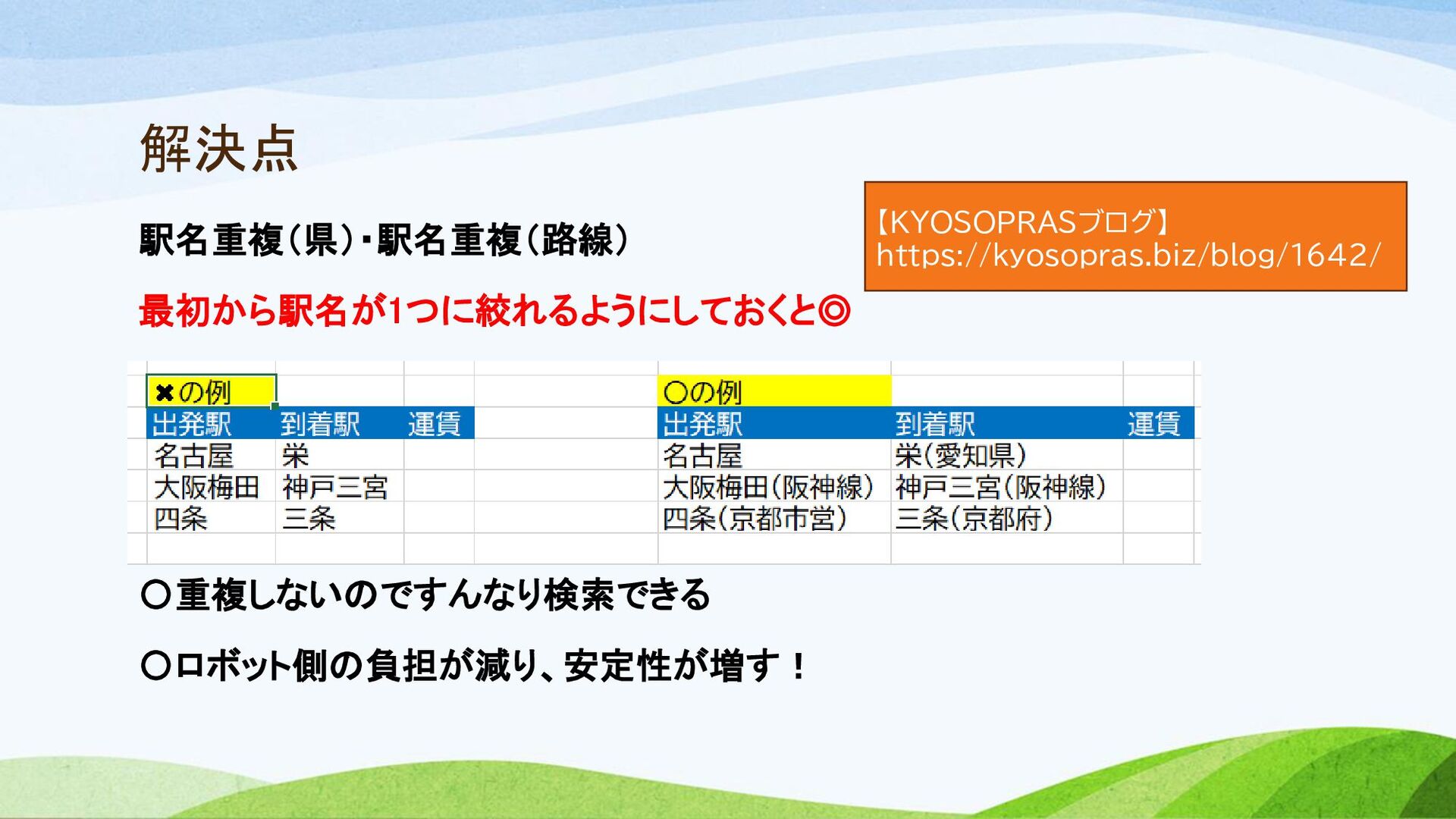 解決点 駅名重複(県)・駅名重複(路線) 最初から駅名が1つに絞れるようにしておくと◎ 〇重複しないのですんなり検索できる 〇ロボット側の負担が減り、安定性が増す! 【KYOSOPRASブログ】 https://kyosopras.biz/blog/1642/