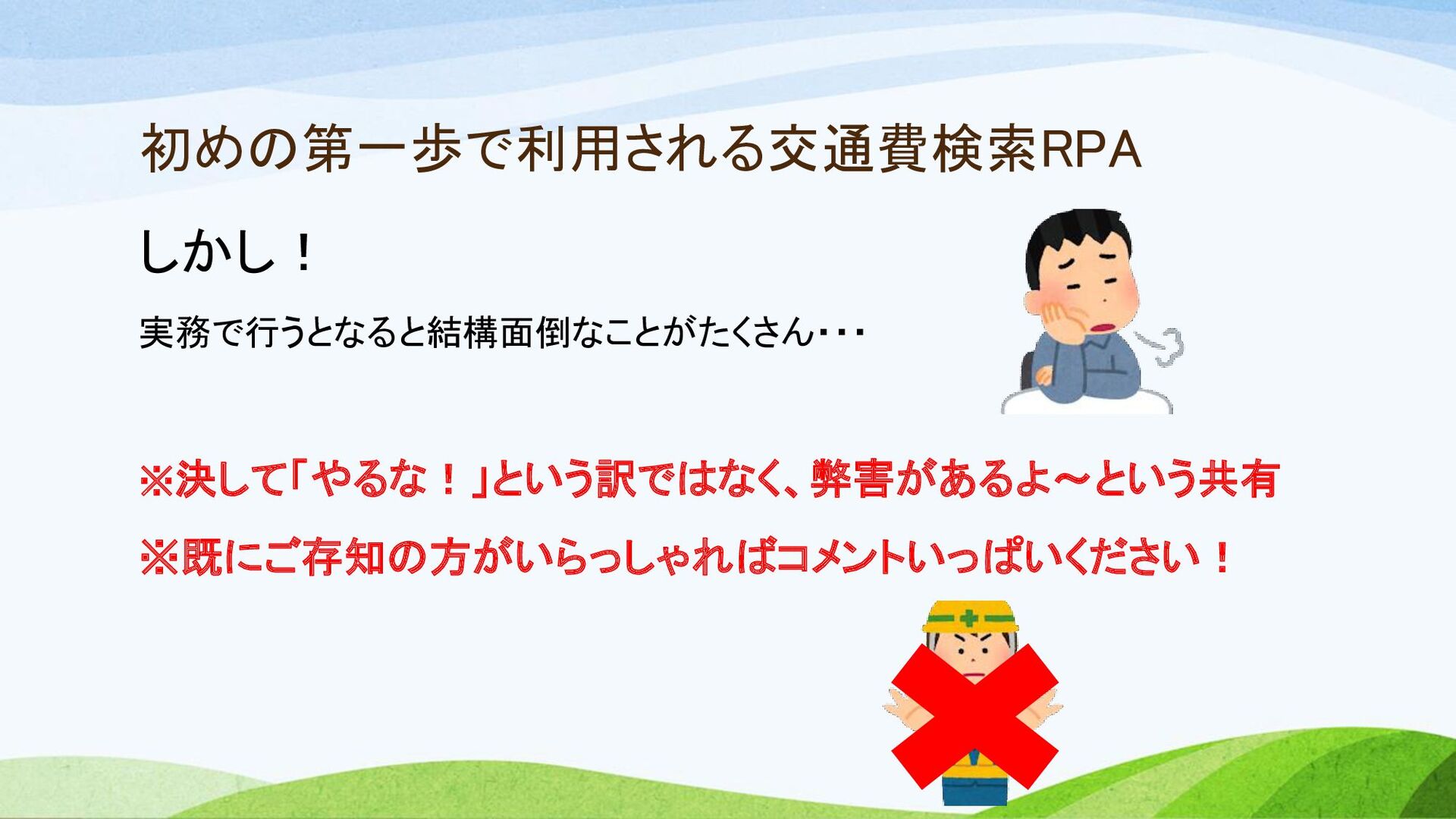 初めの第一歩で利用される交通費検索RPA しかし! 実務で行うとなると結構面倒なことがたくさん・・・ ※決して「やるな!」という訳ではなく、弊害があるよ~という共有 ※既にご存知の方がいらっしゃればコメントいっぱいください!