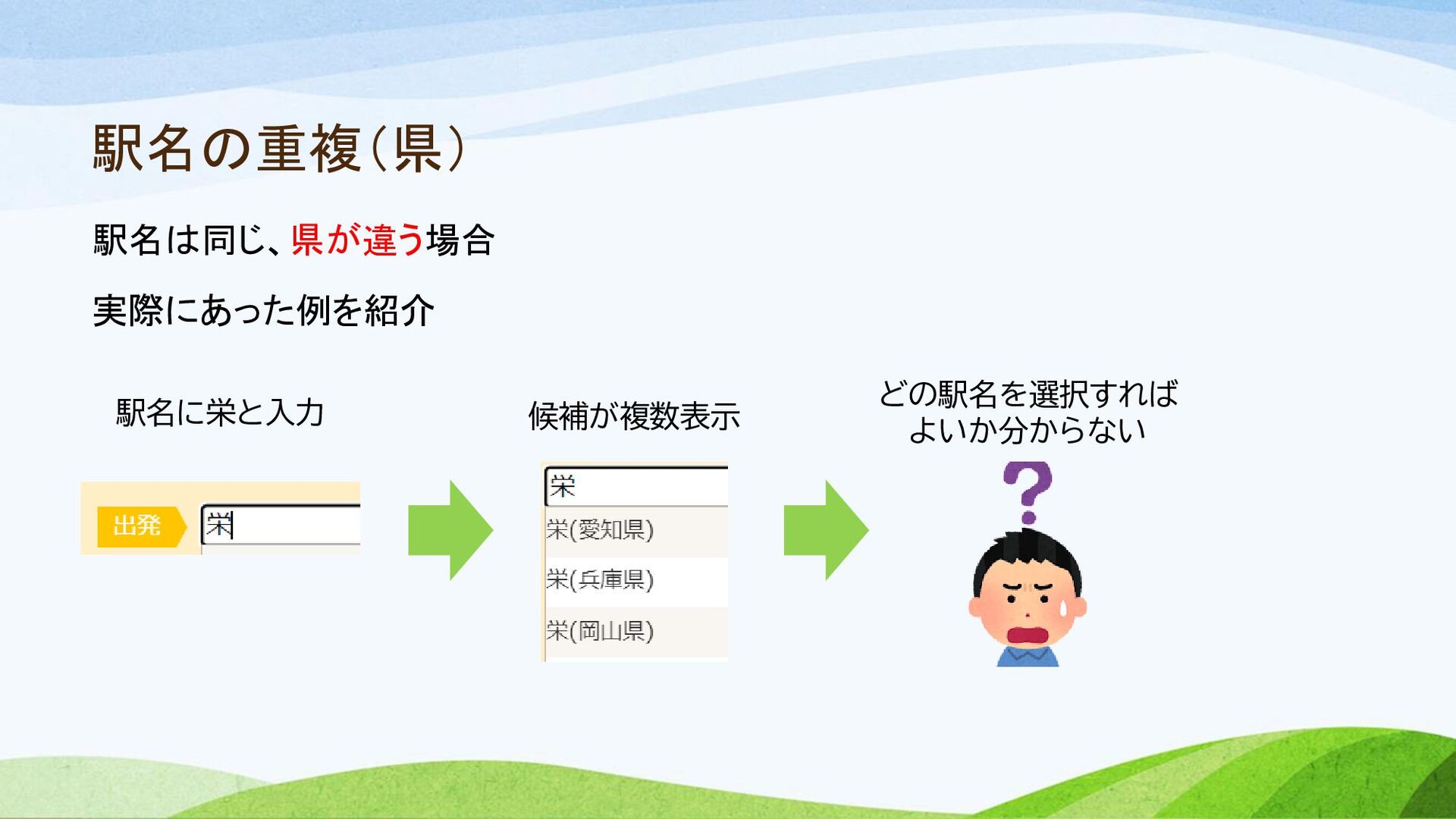 駅名の重複(県) 駅名は同じ、県が違う場合 実際にあった例を紹介 駅名に栄と入力 候補が複数表示 どの駅名を選択すれば よいか分からない