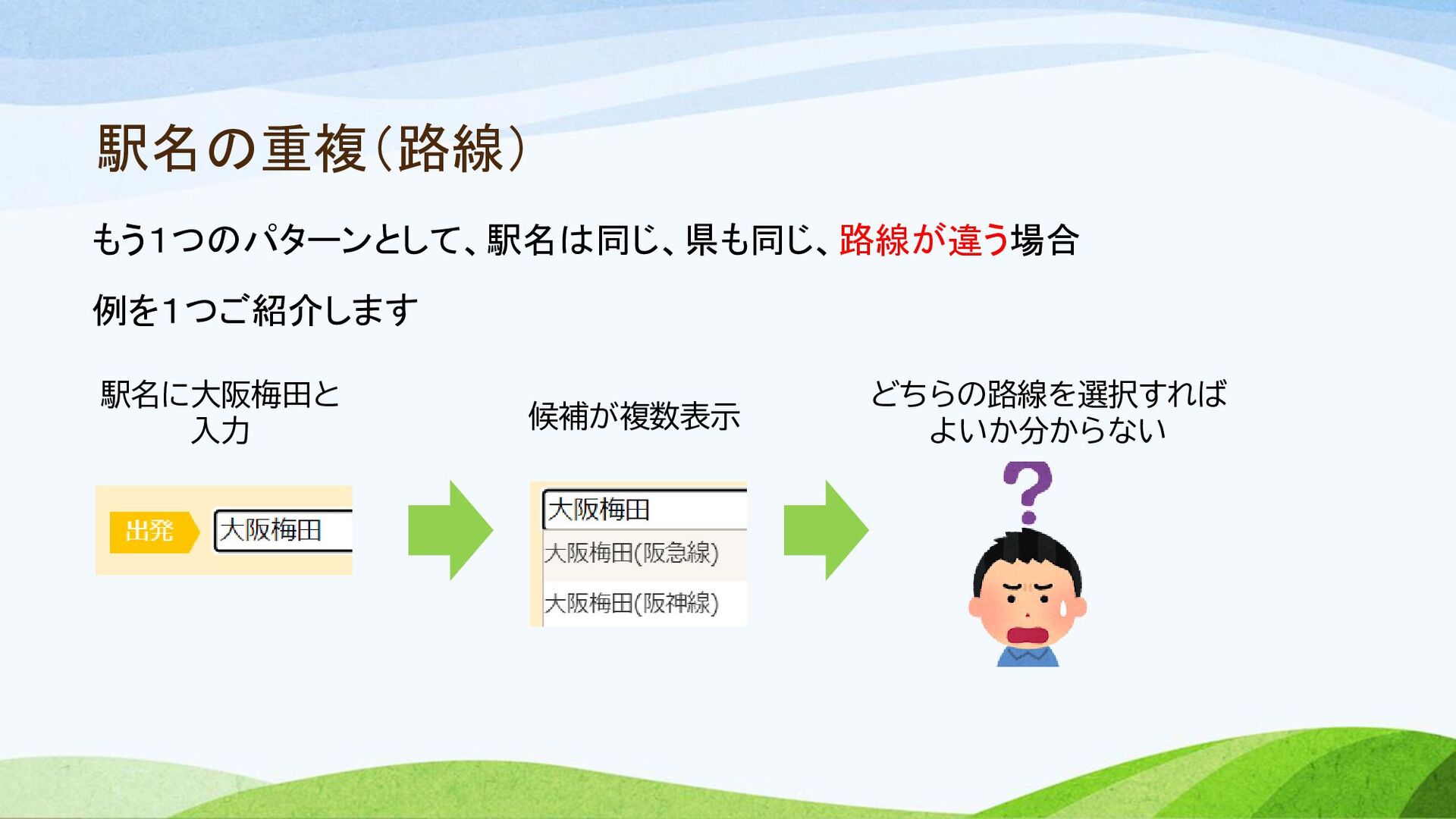 駅名の重複(路線) もう1つのパターンとして、駅名は同じ、県も同じ、路線が違う場合 例を1つご紹介します 駅名に大阪梅田と 入力 候補が複数表示 どちらの路線を選択すれば よいか分からない