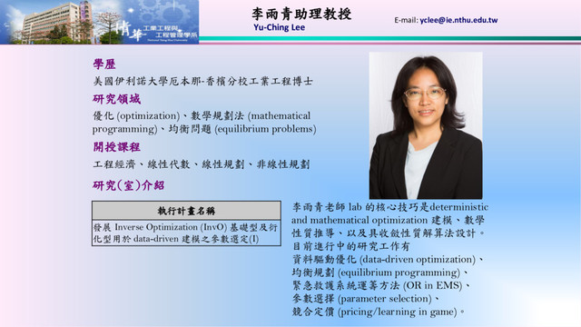 (equilibrium problems) 開授課程 工程經濟、線性代數、線性規劃、非線性規劃 研究(室)介紹 執行計畫名稱 發展 Inverse Optimization (InvO) 基礎型及衍 化型用於 data-driven 建模之參數選定(I) E-mail: