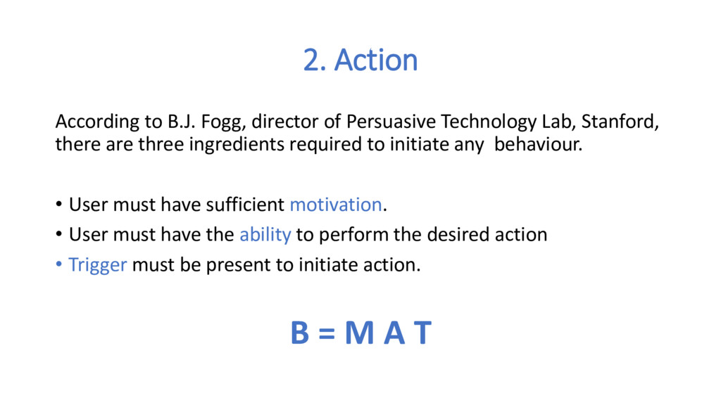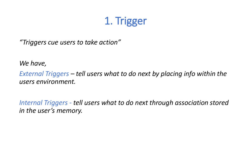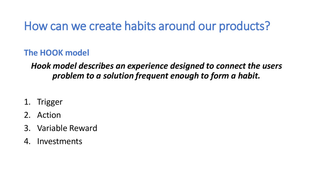 ask yourself these questions: • What do users really want? What pain is your product relieving?(Internal Trigger) • What brings users to your product? (External Trigger) • What is the simplest action users take in anticipation of reward and how can you simplify your product to make the action easier? (Action) • Are users fulfilled by the reward yet left wanting more? (Variable Reward) • What bit of work do users invest in your product? Does it load the next trigger and store value to improve the product with use? (Investment)