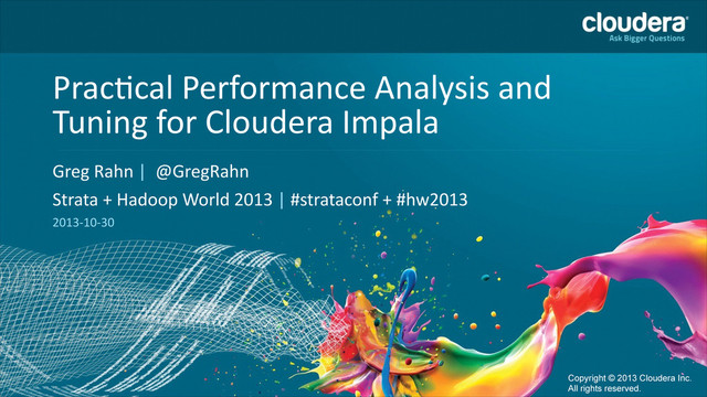 Impala brings SQL to Hadoop, but it also brings SQL performance tuning to those using the platform. This technical session will cover several topics in Impala performance analysis including understanding query execution plans, the use of query hints, interpreting Impala’s built-in query instrumentation as well as examination of Impala’s hardware resource utilization for different queries and workloads. We’ll also discuss design choices like table partitioning and file formats, including the Parquet columnar storage format for Hadoop.