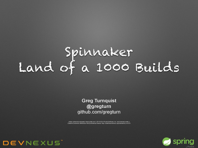 Inc. and licensed under a Creative Commons Attribution-NonCommercial license: http://creativecommons.org/licenses/by-nc/3.0/ Spinnaker Land of a 1000 Builds Greg Turnquist @gregturn github.com/gregturn