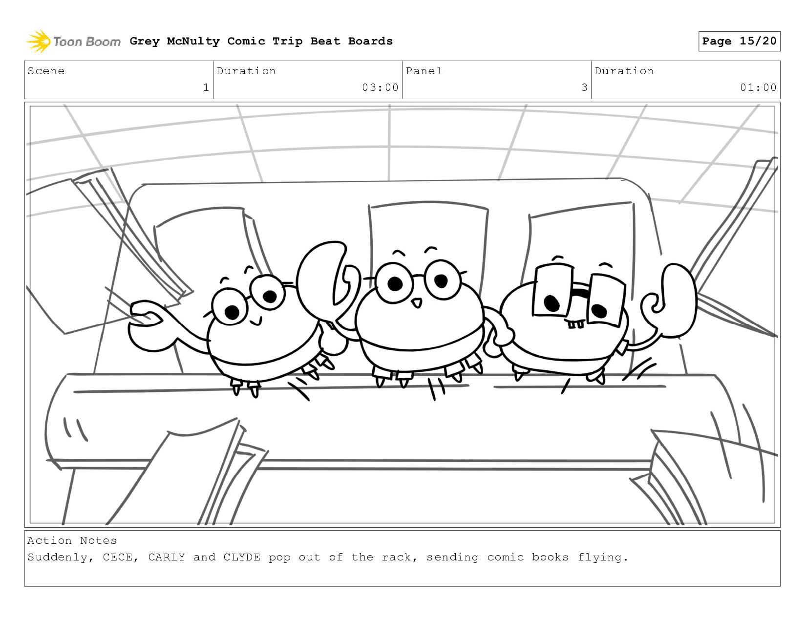 Suddenly, CECE, CARLY and CLYDE pop out of the rack, sending comic books flying. Grey McNulty Comic Trip Beat Boards Page 15/20