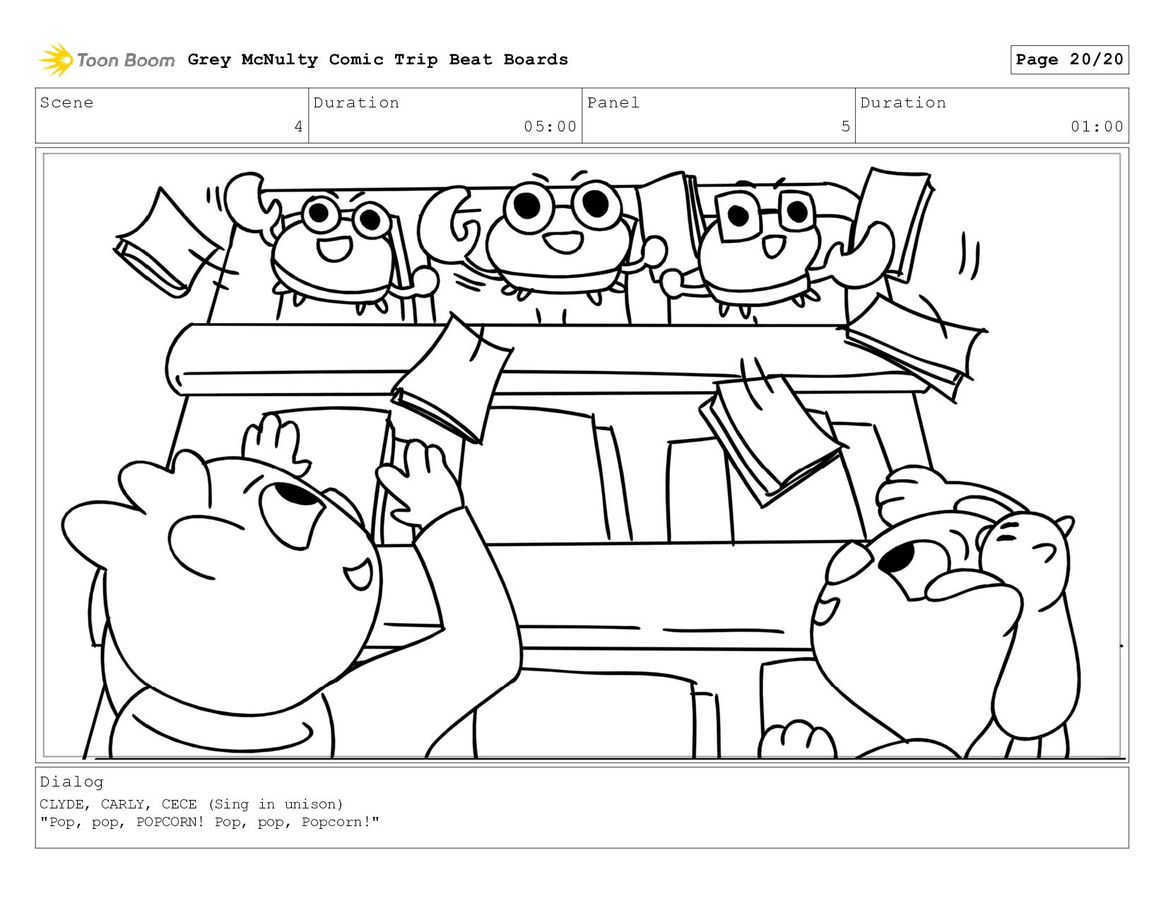 CARLY, CECE (Sing in unison) "Pop, pop, POPCORN! Pop, pop, Popcorn!" Grey McNulty Comic Trip Beat Boards Page 20/20