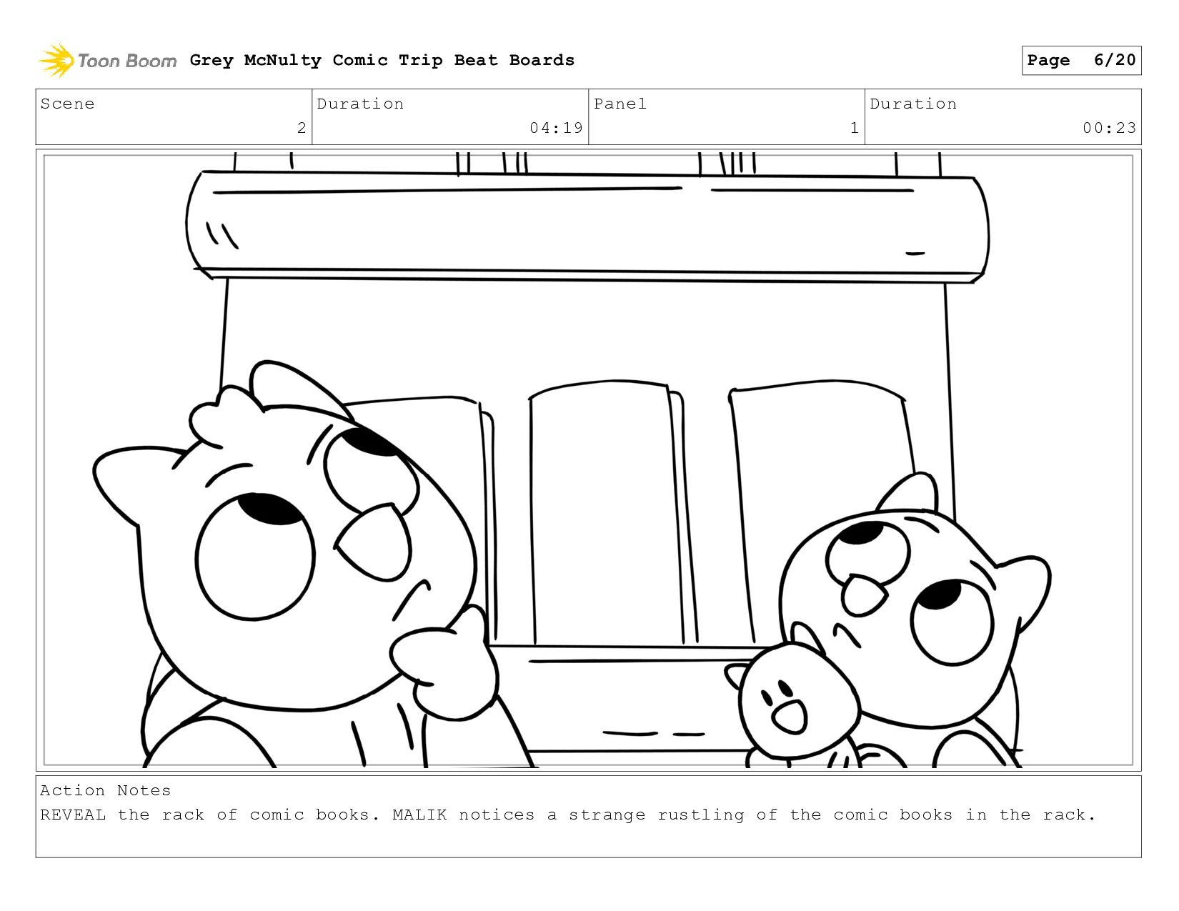 REVEAL the rack of comic books. MALIK notices a strange rustling of the comic books in the rack. Grey McNulty Comic Trip Beat Boards Page 6/20