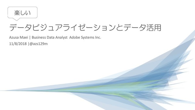 a u U s e r G r o u p 2 0 1 8 自己紹介(仕事) Azusa Maei / 前井 梓 Adobe Systems Inc. Tokyo, Japan 普段はビッグデータアナリストとして、Hadoop(HueとHive) や各種BI(Tableau, Power BI中心)を使用して 分析やレポーティング業務を行っています。 Tableau歴は2年程度、 以前は営業/企画部門でお仕事をしていました。 元WEBデザイナー/コーダーである経験を、 今のダッシュボードデザインに活かしております。 Photoshopをバリバリ使うデータアナリスト です。 @azs129m