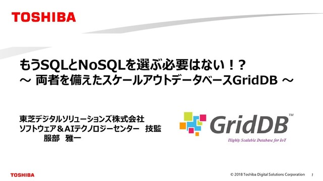1. 1 © 2018 Toshiba Digital Solutions Corporation もうSQLとNoSQLを選ぶ必要はない!? ~ 両者を備えたスケールアウトデータベースGridDB