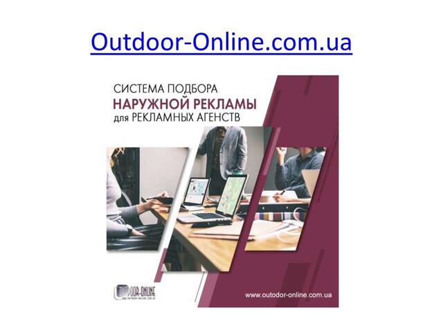 наружной рекламе на территории всех областей Украины 24 часа в сутки 7 дней в неделю. Основная цель проекта - предоставить полную и информацию о занятости ресурсов для формирования качественных рекламных кампаний и автоматизации процесса баинга плоскостей. Outdoor-Online позволяет: - осуществлять оперативный подбор рекламных кампаний в реальном времени - отслеживать актуальное состояние занятости(бронь, резерв, цены, скидки) по следующим видам конструкций: крышные конструкции, пиллары, брэндмауэры, суперсайты, призматроны, биллборды, троллы, скроллы, пилоны, ситилайты и др. - получить доступ к БД всех операторов наружной рекламы в Украине, подключенных к системе (более 200) - формировать презентации отобранных плоскостей в стандартном виде (. xls, .pdf) с независимой кодировкой. Ссылки на фото/схемы/карты в презентациях ведут на независимый сайт-хостинг outdoorphoto.com.ua - использовать «облачные» технологии для удобства хранения, доступа и передачи информации (презентации с онлайн ссылками, фотоотчеты, макеты в «облаке», др.) - использовать онлайн карту для поиска, вывода и отбора и адресных программ - видеть прямые контакты операторов, рекламные агентства напрямую общаются с операторами - самостоятельно наносить те плоскости на карту, которые не были еще нанесены. - Осуществлять онлайн-заказ широкоформатной печати: https://print.outdoor-online.com.ua/ ПРЕЗЕНТАЦИЯ СИСТЕМЫ