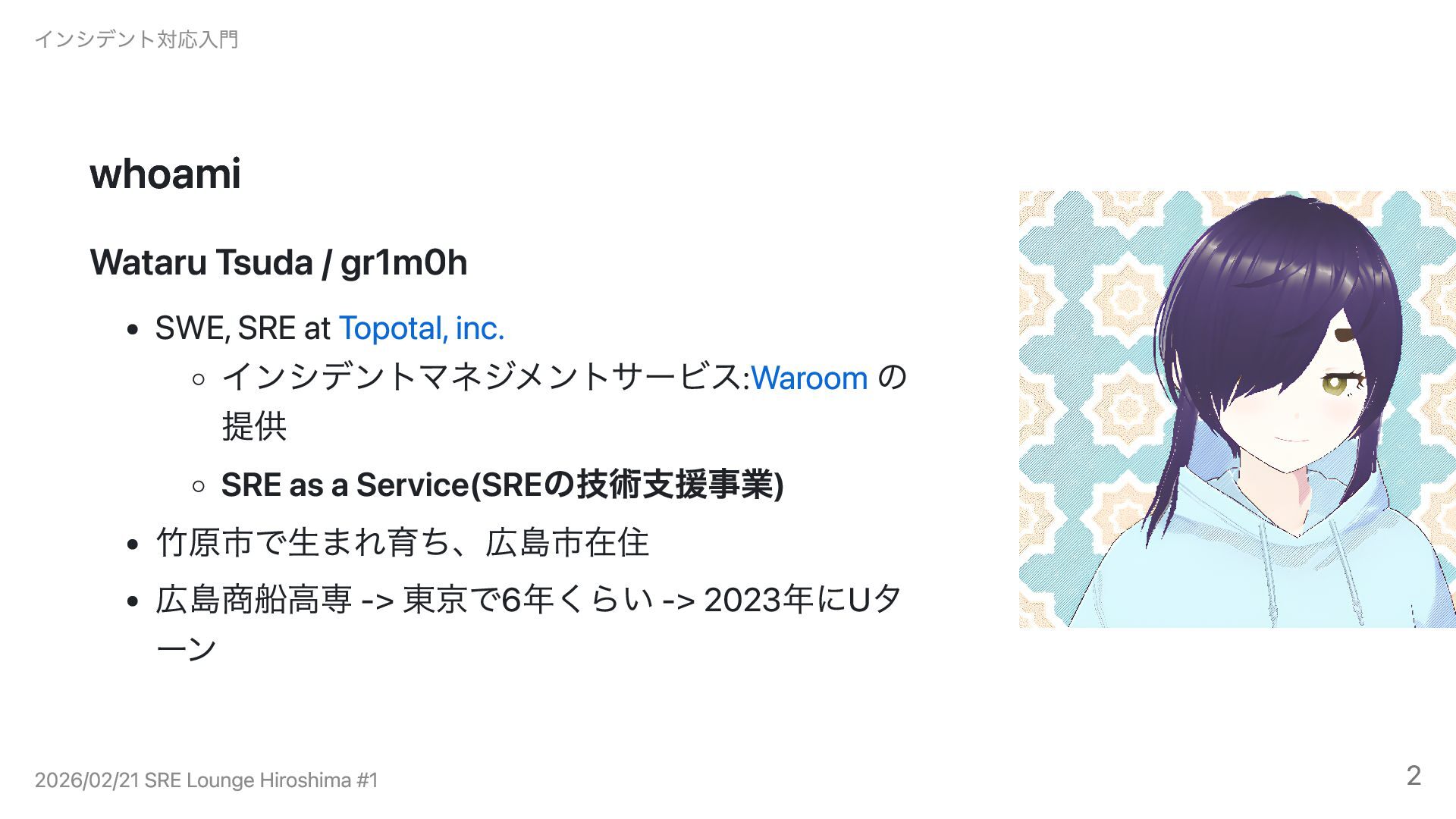 インシデントマネジメントSaaS: Waroom SRE as a Service(SREの技術支援) 竹原市で生まれ育ち、広島市在住 広島商船高専 -> 東京(港区 -> 中野区) -> 2023年にUター ン インシデント対応入門 2026/02/21 SRE Lounge Hiroshima #1 2
