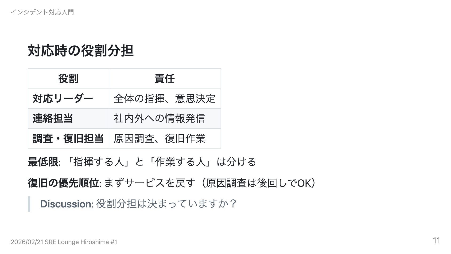 「指揮する人」と「作業する人」は分ける 復旧の優先順位: まずサービスを戻す(原因調査は後回しでOK) Discussion: 役割分担は決まっていますか? インシデント対応入門 2026/02/21 SRE Lounge Hiroshima #1 11