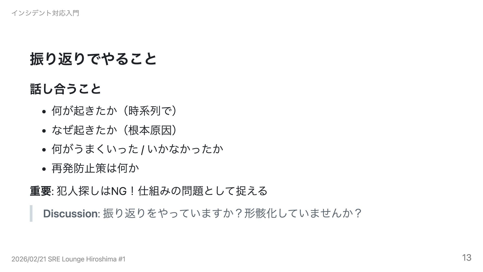 Discussion: 振り返りをやっていますか?形骸化していませんか? インシデント対応入門 2026/02/21 SRE Lounge Hiroshima #1 13