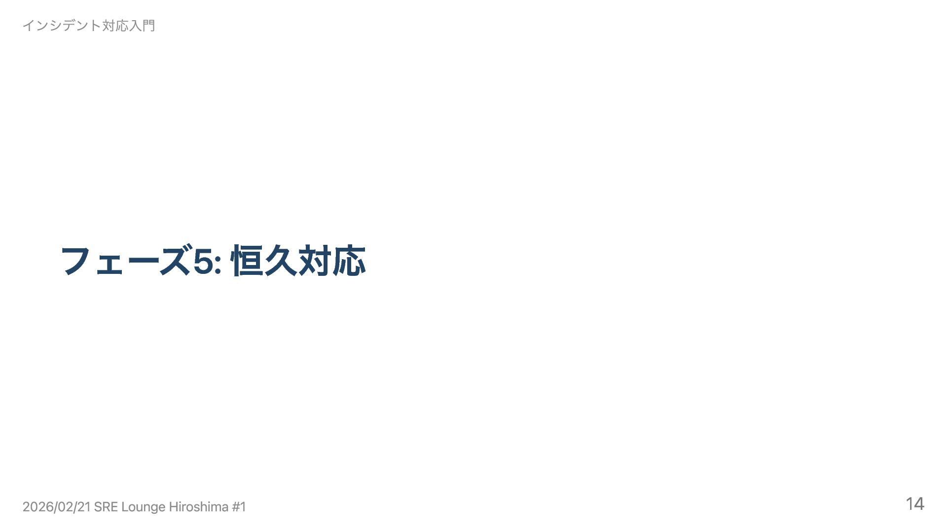 フェーズ5: 恒久対応 インシデント対応入門 2026/02/21 SRE Lounge Hiroshima #1 14