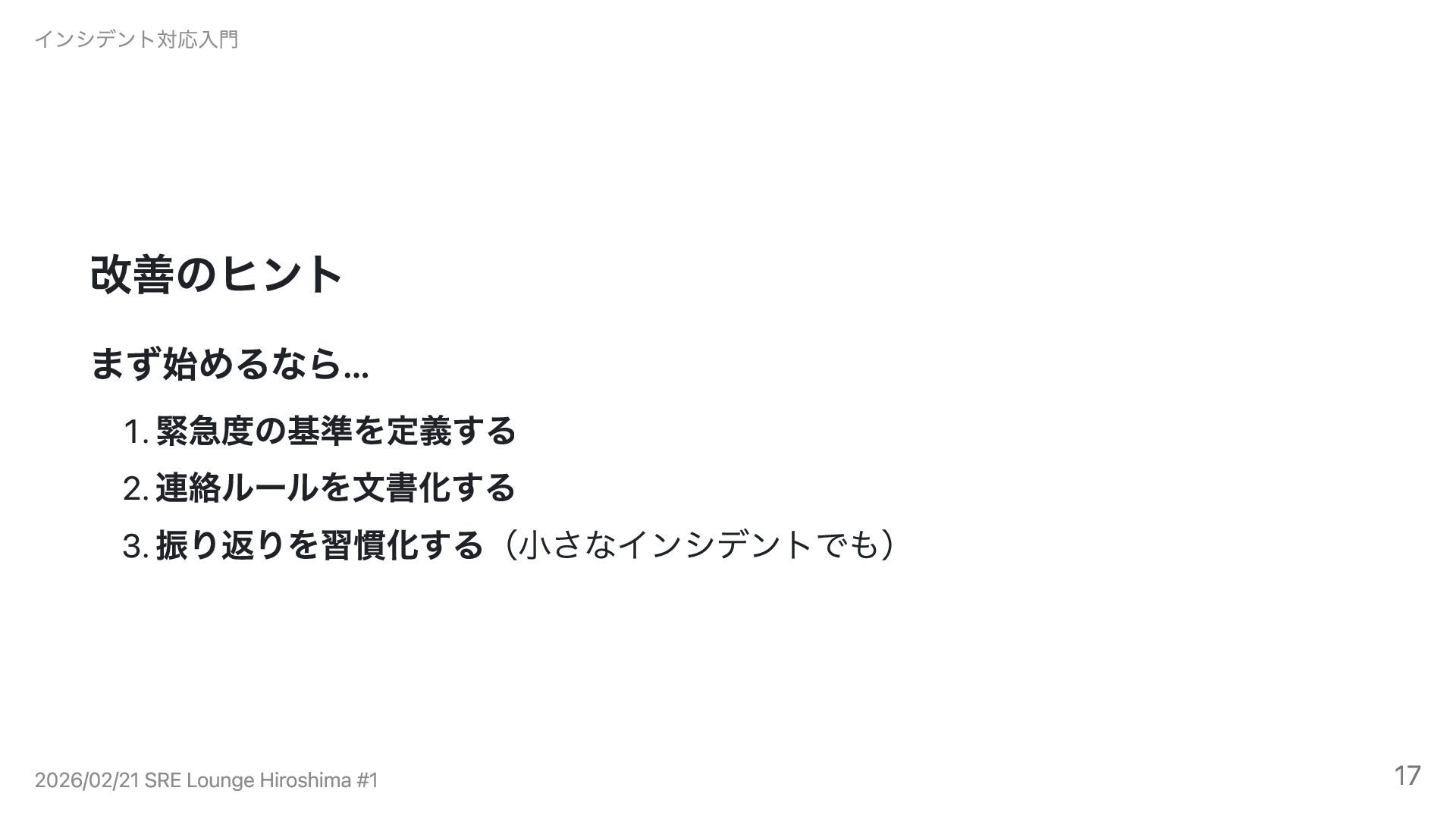 改善のヒント まず始めるなら... 1. 緊急度の基準を定義する 2. 連絡ルールを文書化する 3. 振り返りを習慣化する(小さなインシデントでも) インシデント対応入門 2026/02/21