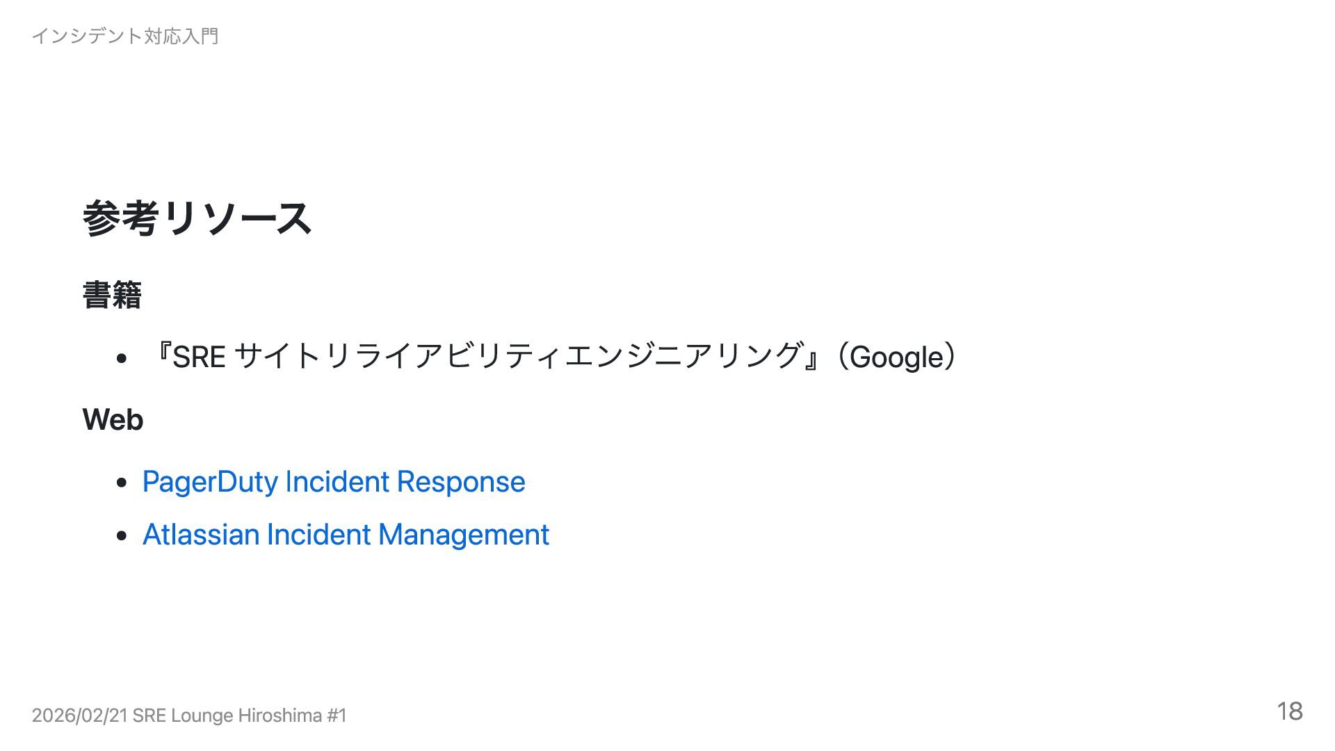 Incident Management インシデント対応入門 2026/02/21 SRE Lounge Hiroshima #1 18