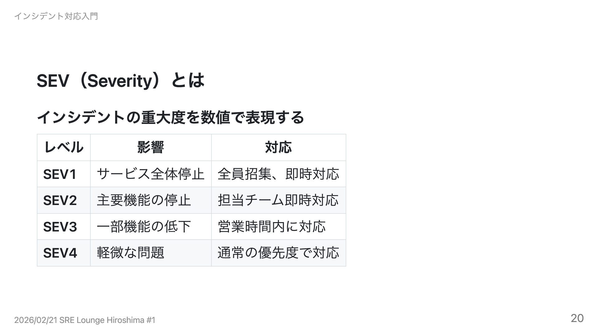 担当チーム即時対応 SEV3 一部機能の低下 営業時間内に対応 SEV4 軽微な問題 通常の優先度で対応 インシデント対応入門 2026/02/21 SRE Lounge Hiroshima #1 20