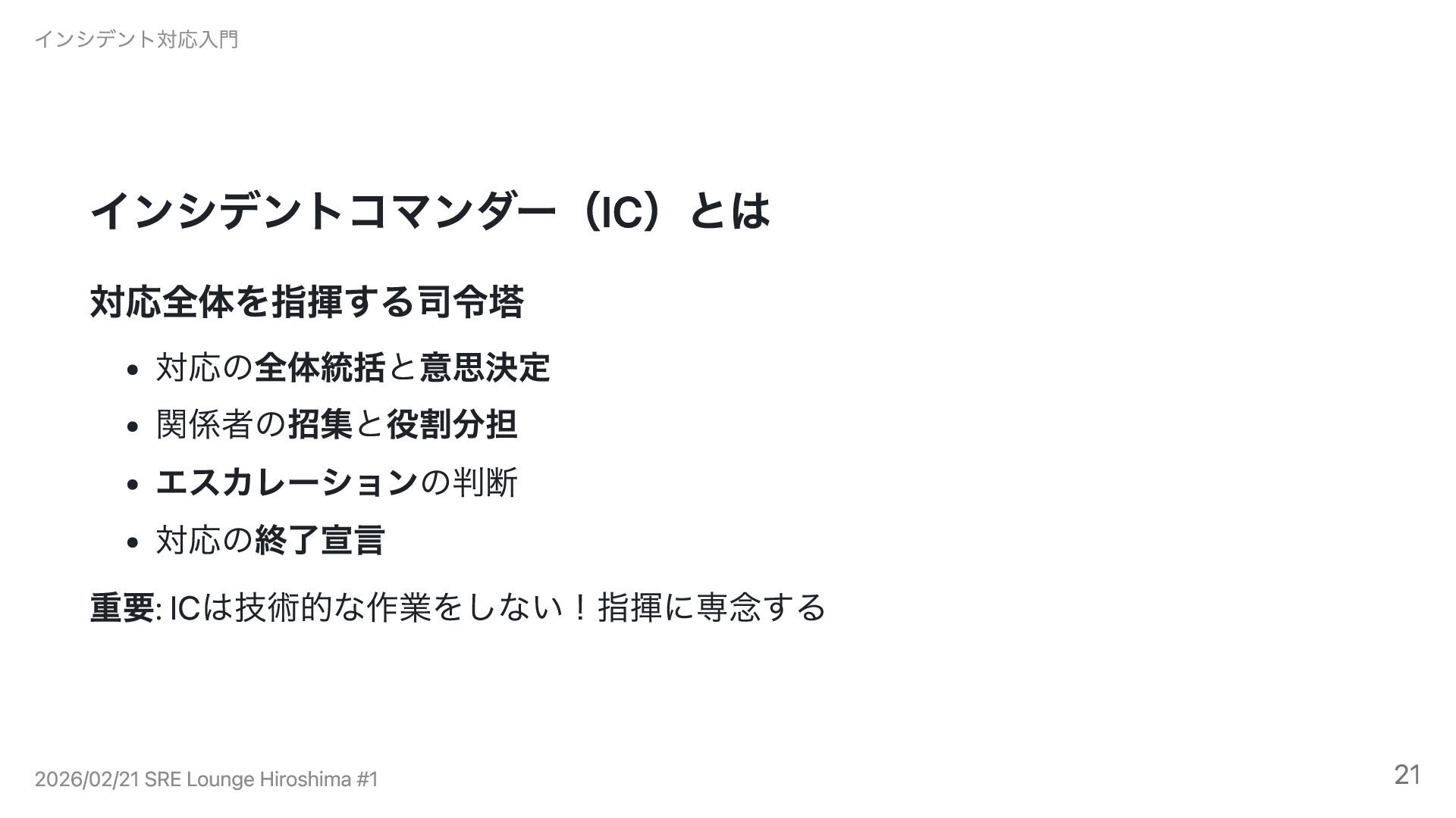 インシデントコマンダー(IC)とは 対応全体を指揮する司令塔 対応の全体統括と意思決定 関係者の招集と役割分担 エスカレーションの判断 対応の終了宣言 重要: ICは技術的な作業をしない!指揮に専念する インシデント対応入門 2026/02/21