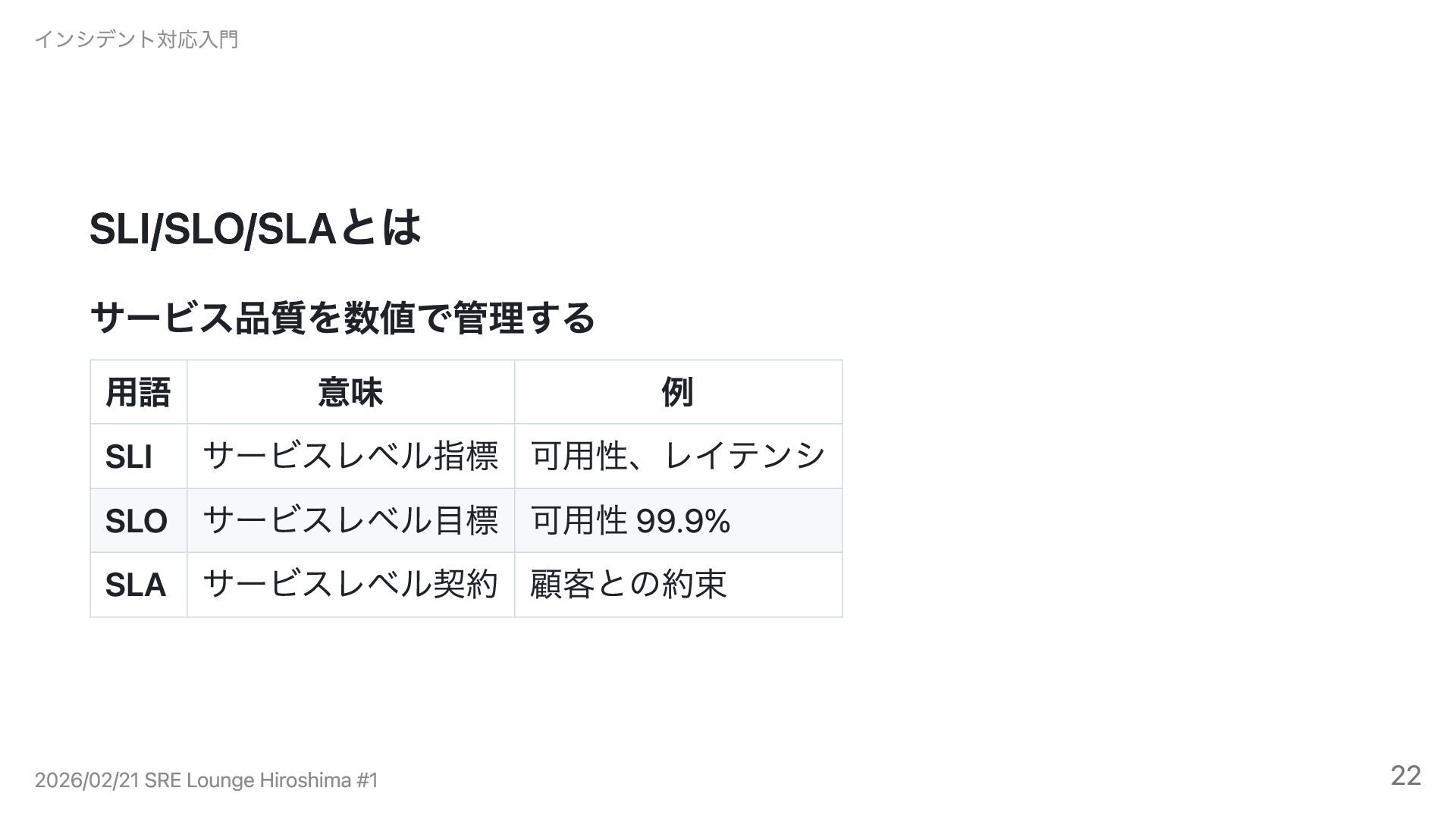可用性 99.9% SLA サービスレベル契約 顧客との約束 インシデント対応入門 2026/02/21 SRE Lounge Hiroshima #1 22