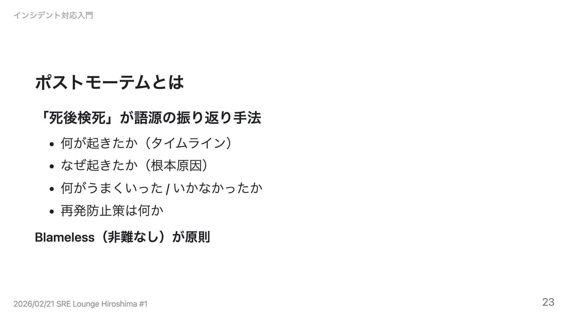 ポストモーテムとは 「死後検死」が語源の振り返り手法 何が起きたか(タイムライン) なぜ起きたか(根本原因) 何がうまくいった / いかなかったか 再発防止策は何か Blameless(非難なし)が原則 インシデント対応入門