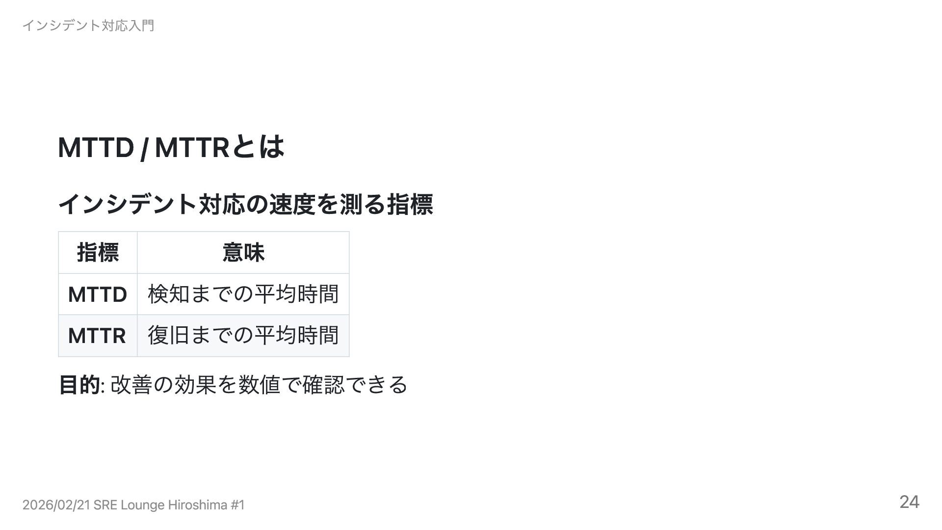 MTTRの問題点 インシデントごとのばらつきが大きく、平均値の信頼性が低い 各インシデントの復旧時間を10%短縮しても、約50%のケースでMTTRに反映され ない 粒度が粗く、どこを改善すべきか分からない インシデント対応入門 2026/02/21 SRE Lounge Hiroshima #1 24