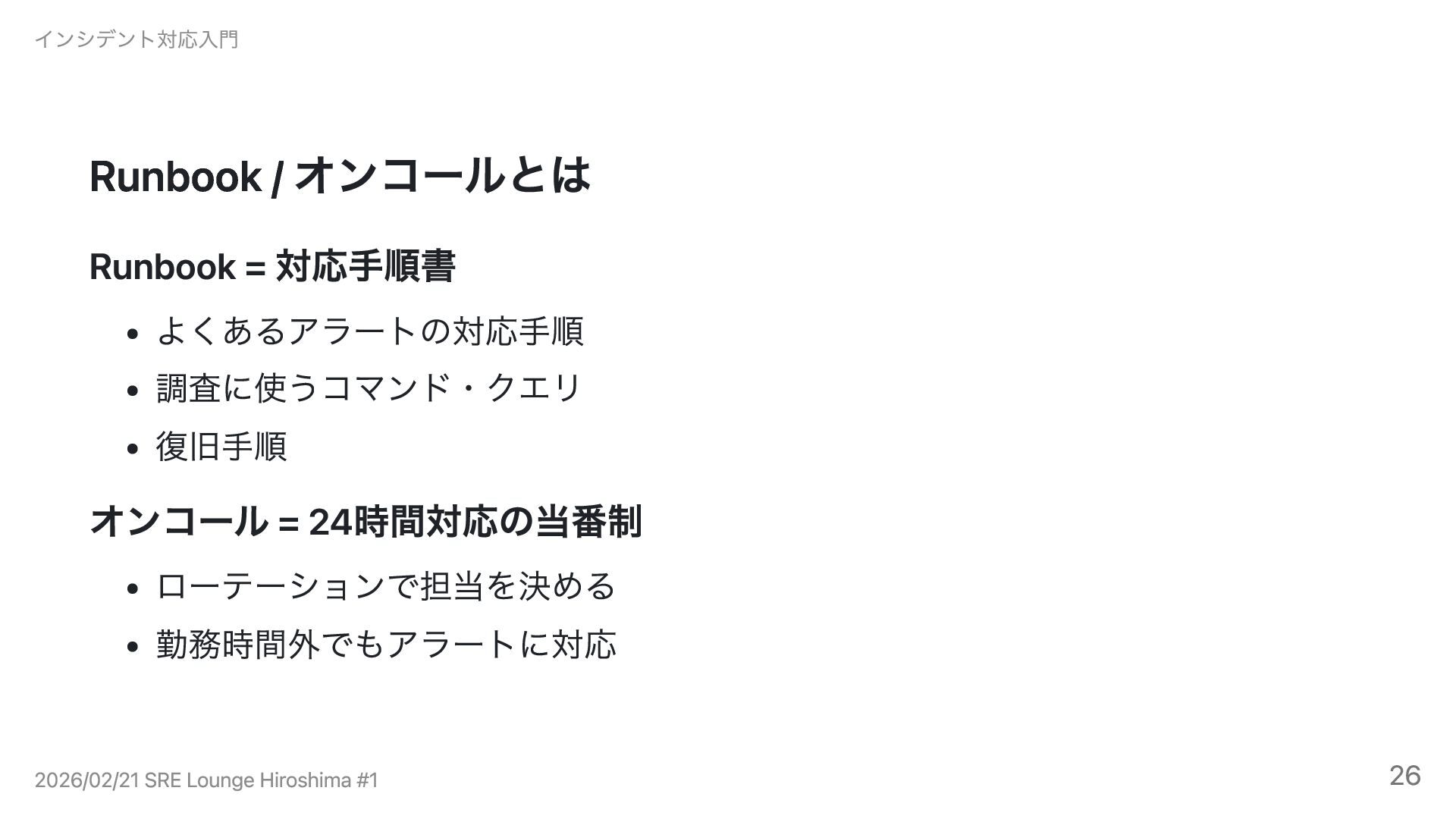 = 24時間対応の当番制 ローテーションで担当を決める 勤務時間外でもアラートに対応 インシデント対応入門 2026/02/21 SRE Lounge Hiroshima #1 26