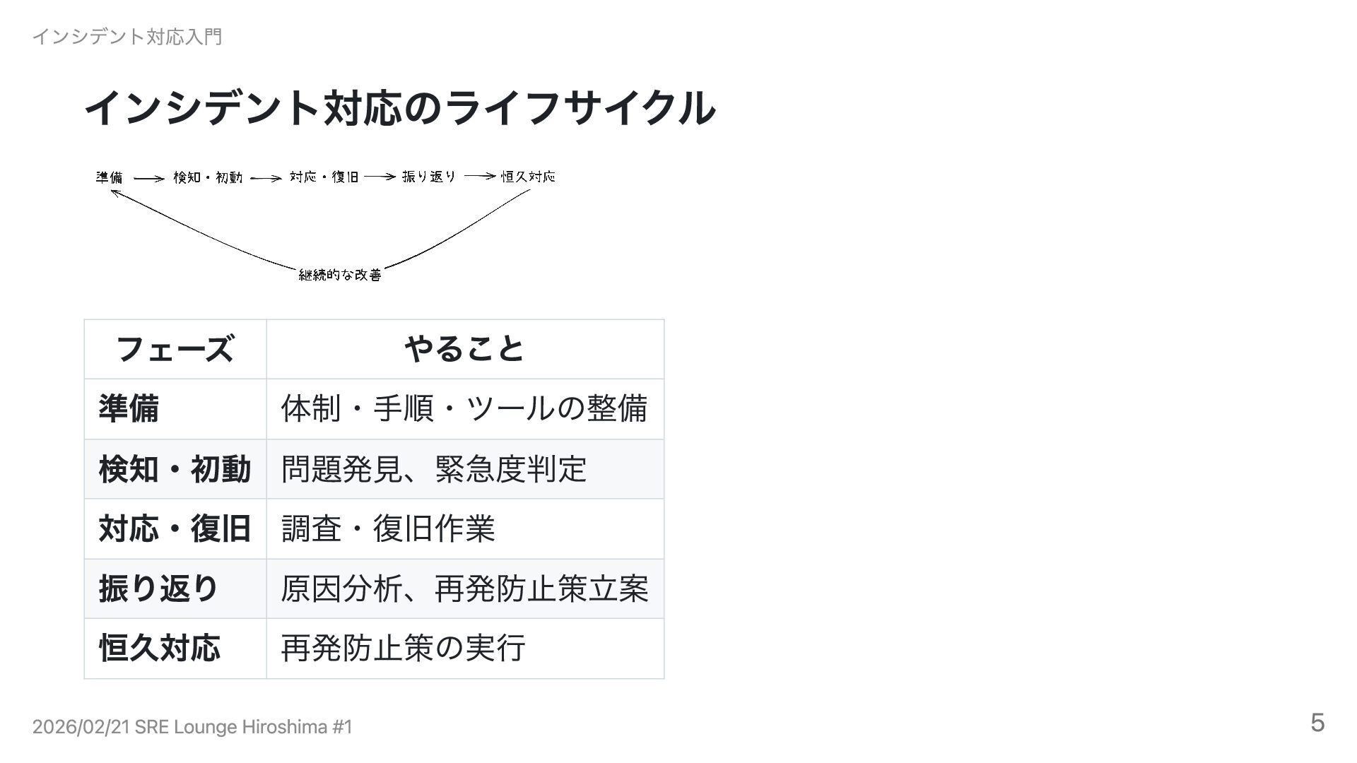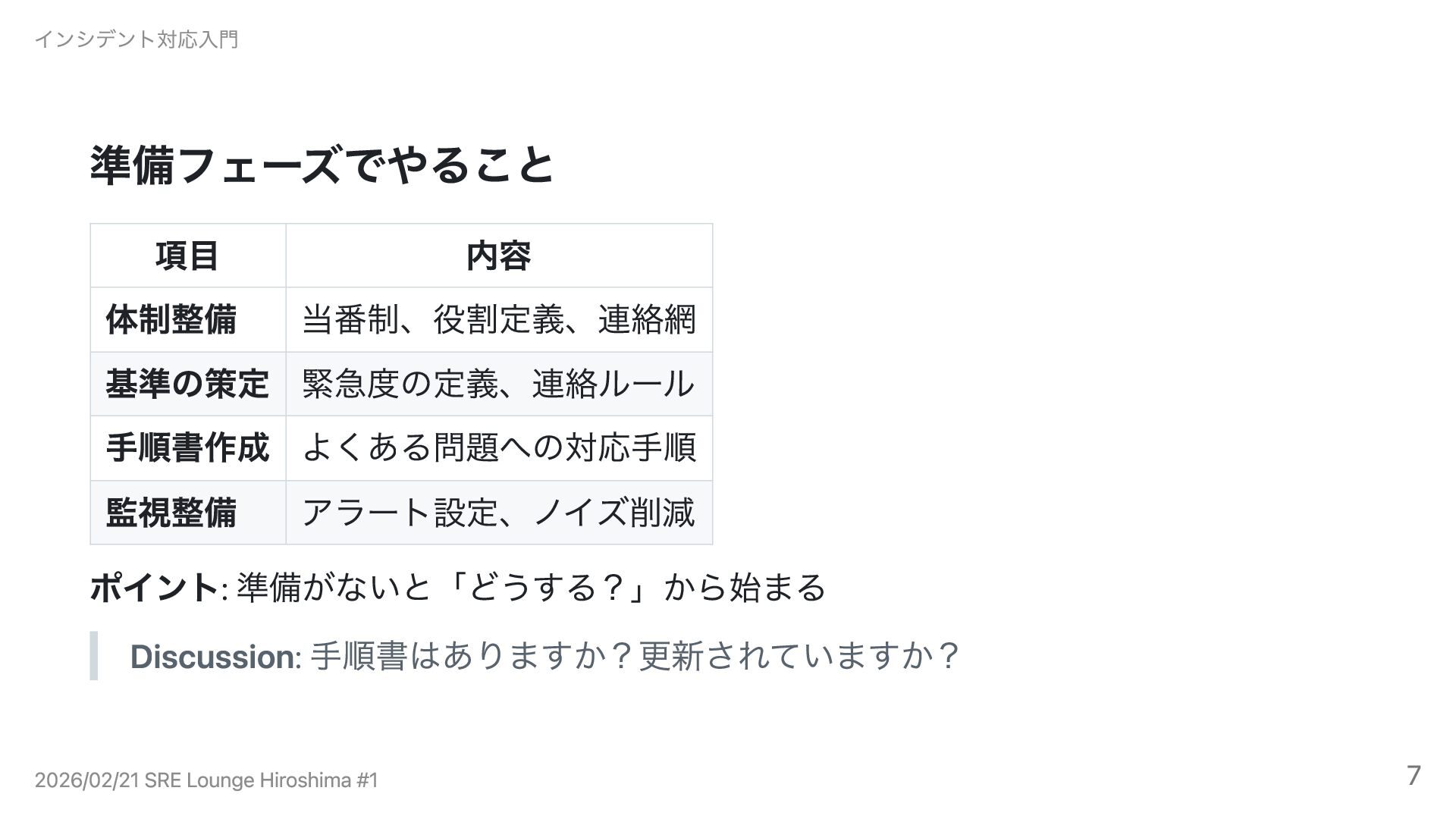 フェーズ1: 準備 インシデント対応入門 2026/02/21 SRE Lounge Hiroshima #1 6