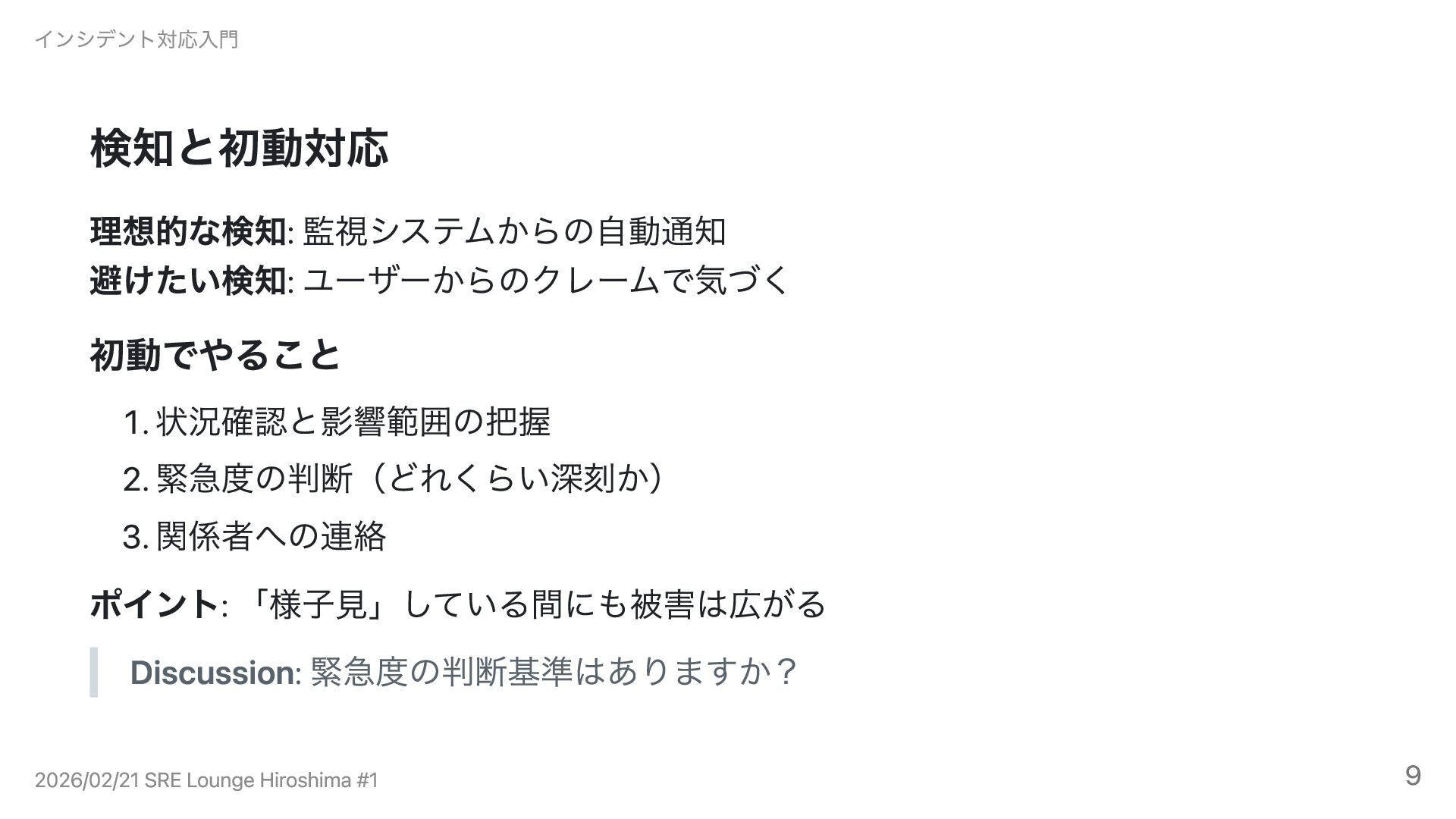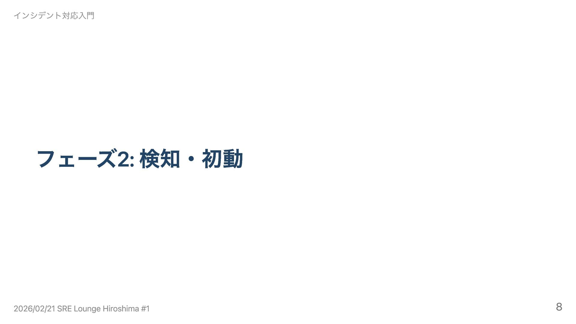 フェーズ2: 検知・初動 インシデント対応入門 2026/02/21 SRE Lounge Hiroshima #1 8