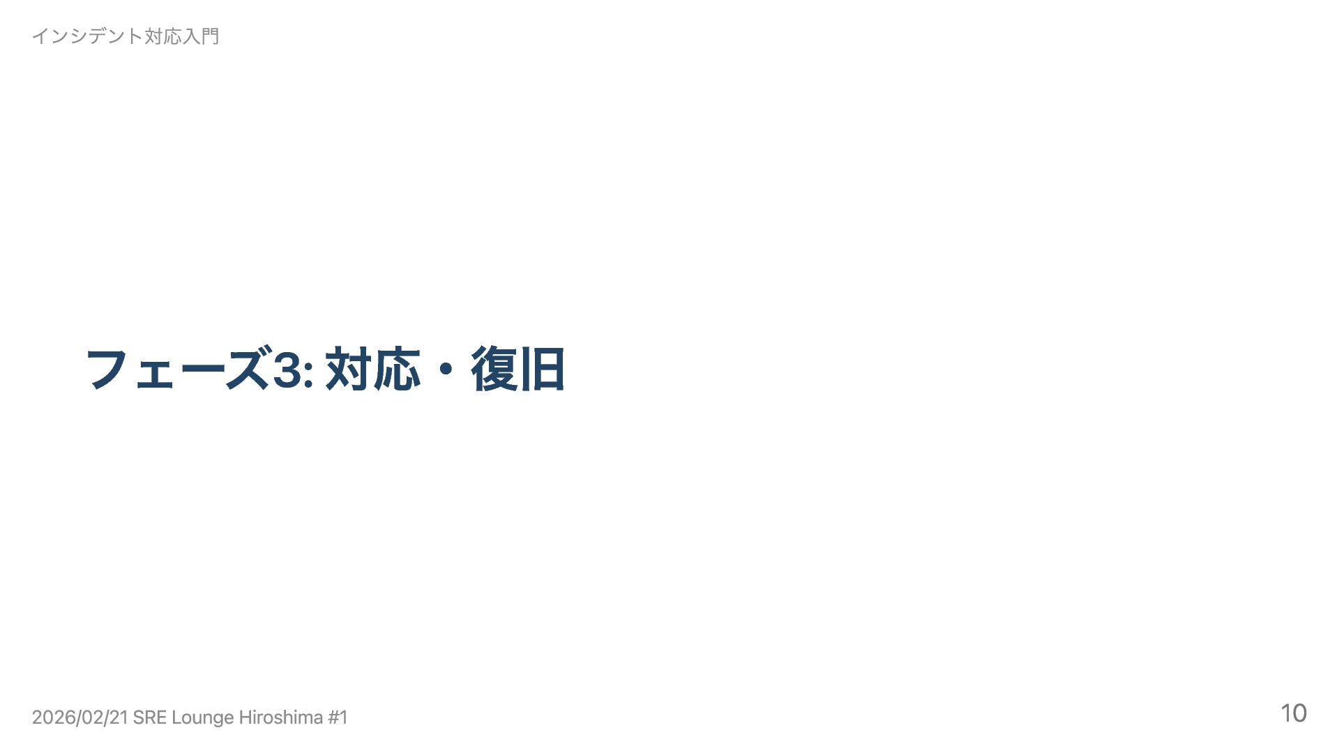 フェーズ3: 対応・復旧 インシデント対応入門 2026/02/21 SRE Lounge Hiroshima #1 10