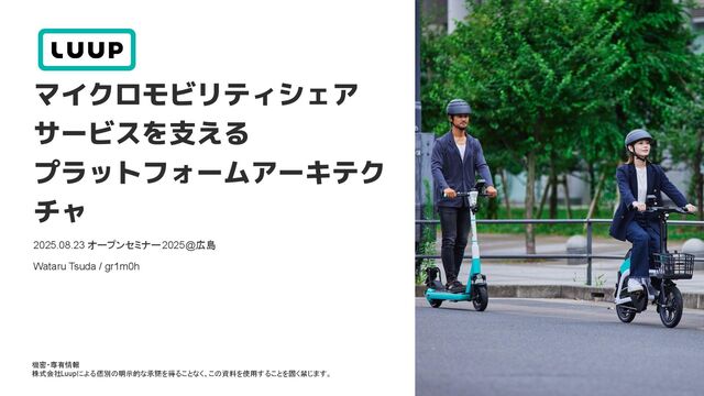 機密・専有情報 株式会社Luupによる個別の明示的な承諾を得ることなく、この資料を使用することを固く禁じます。 Wataru Tsuda / gr1m0h 2025.08.23 オープンセミナー2025@広島 マイクロモビリティシェア サービスを支える